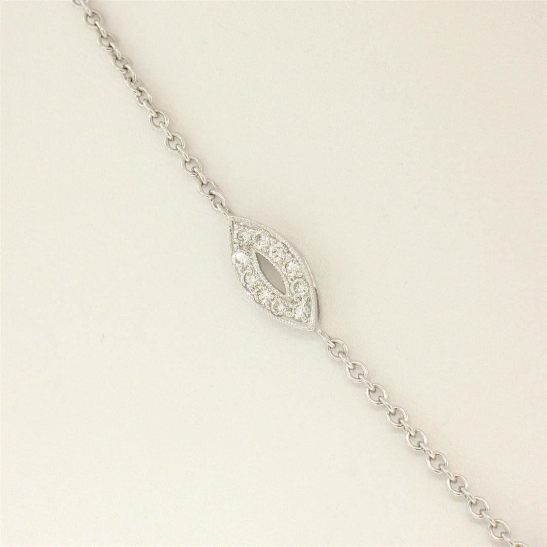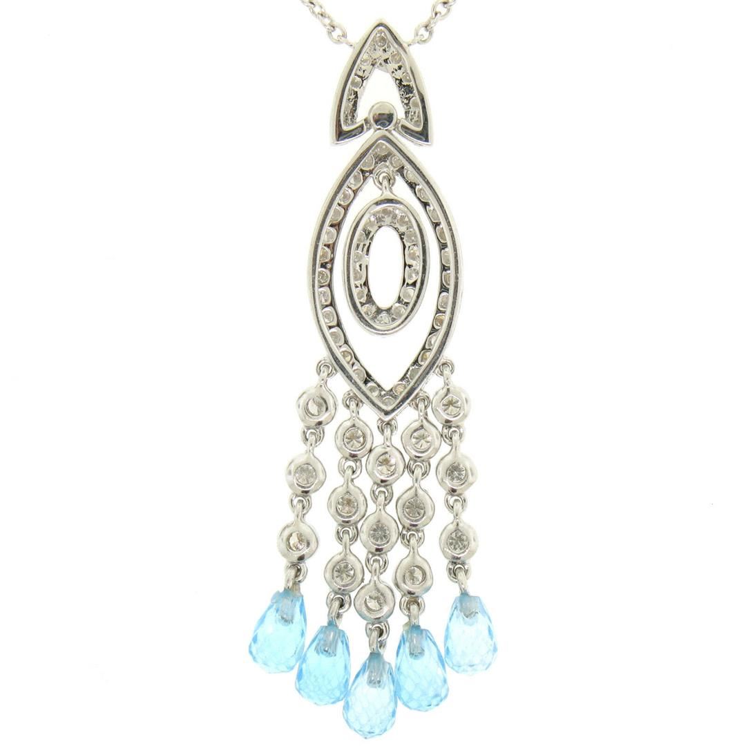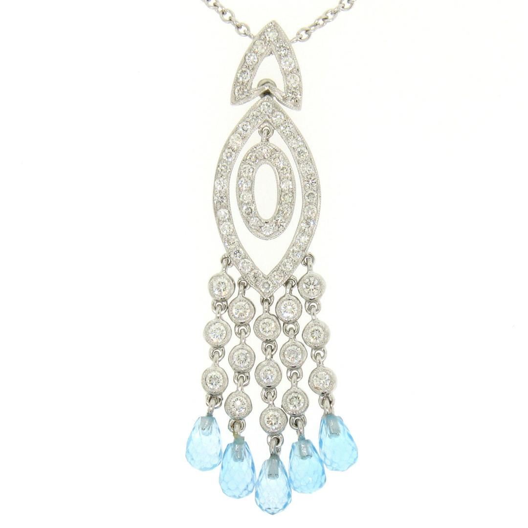 One NEW 18k White Gold 1.30ctw Diamond & Blue Topaz Bead Chandelier Dangle Necklace. Item Details: Material: 18K Solid White Gold, Weight: 11.2 Grams, Stone(s): (86) Natural Genuine Diamonds - Round Brilliant Cut - Pavé & Bezel Set - VS1 Clarity - G Color - 1.30ctw (approx.), (5) Natural Genuine Topaz - Briolette Bead Cut - Stem Set - Blue Color - 4.11x6.16mm(approx.), Total Carat Weight: 1.30 (approx.), Chain Type: Cable Link w/ Pavé Diamond Marquise Stations, Chain Length: 16 Inches, Clasp: Lobster Claw. Pendant Overall Width: 18.70mm. Pendant Overall Height: 54.20mm, 2.134 inches. Pendant Thickness: 2.48mm. Condition: New w/ Tag