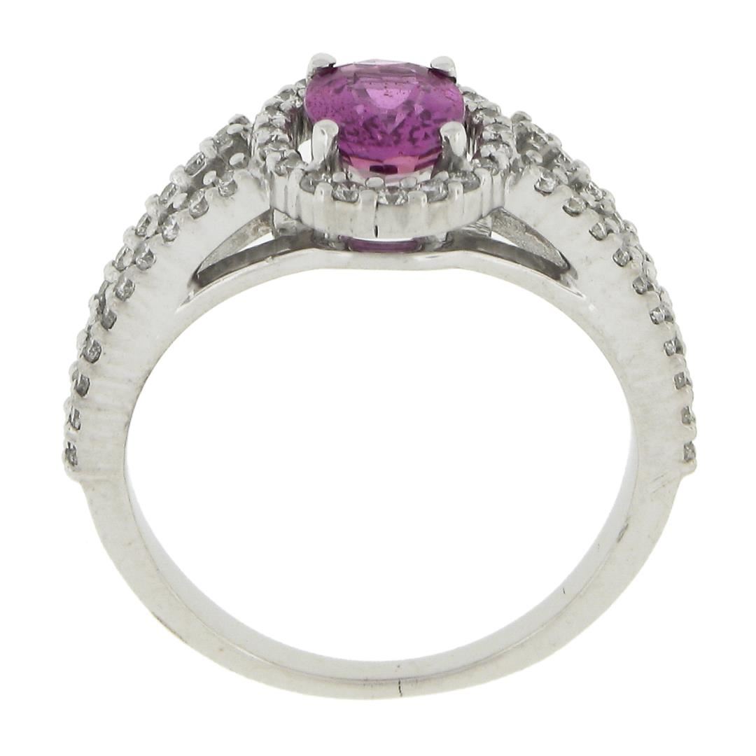 A solid 18k white gold ring, with 1 oval cut natural pink sapphire (1.11ct), and 60 round cut natural diamonds (G-I - VS2-SI2 ; 0.60ctw). The ring is size 6.0, weighs a total of 4.33 grams, and measures 10.5mm wide.