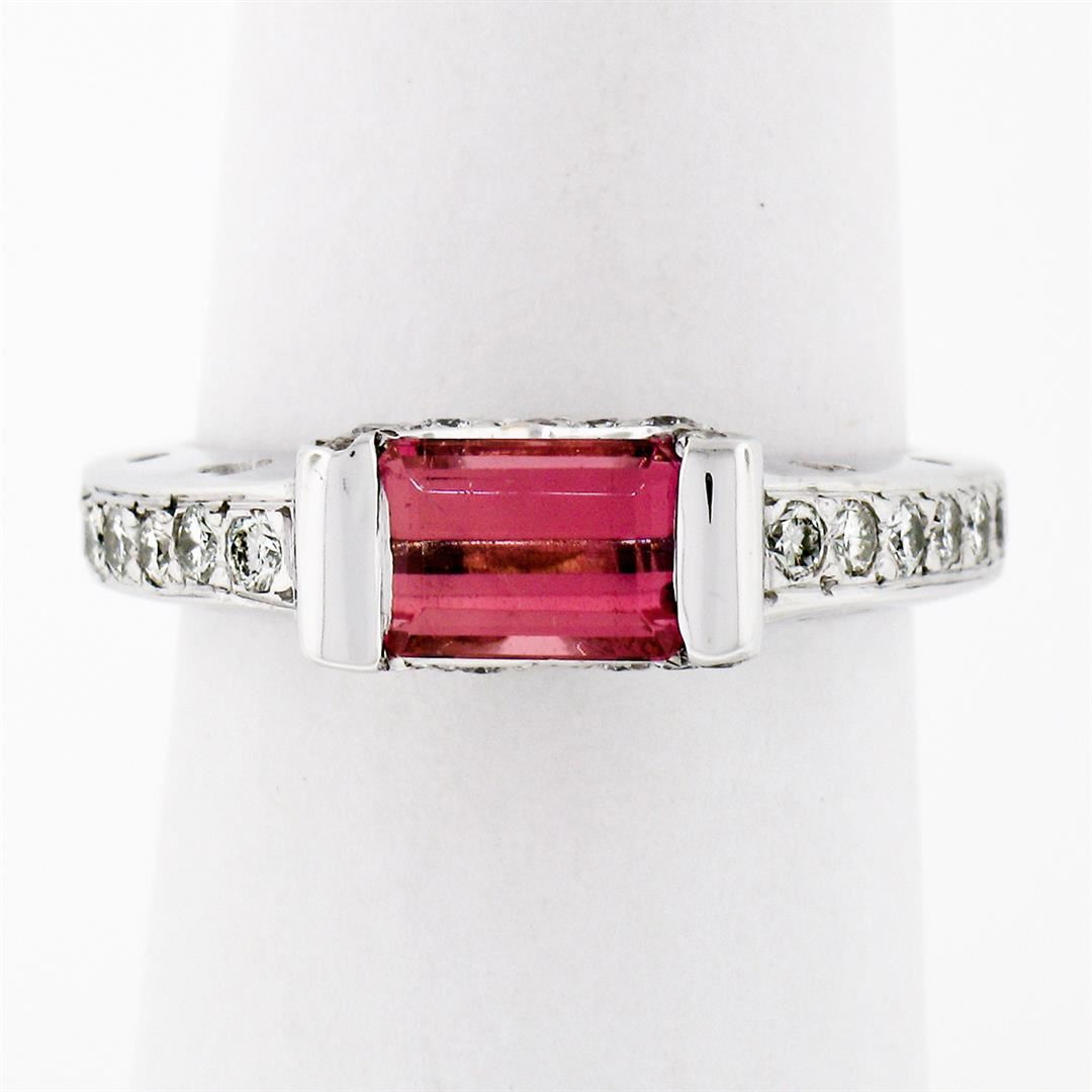 An estate solid 18k white gold sideways solitaire ring, with 1 emerald cut natural tourmaline (1.55ctw), and 26 round brilliant cut natural diamonds (G/H - VS1/VS2 ; 0.50ctw). The ring is size 7.5, weighs a total of 5.35 grams, and measures 5.78mm wide.