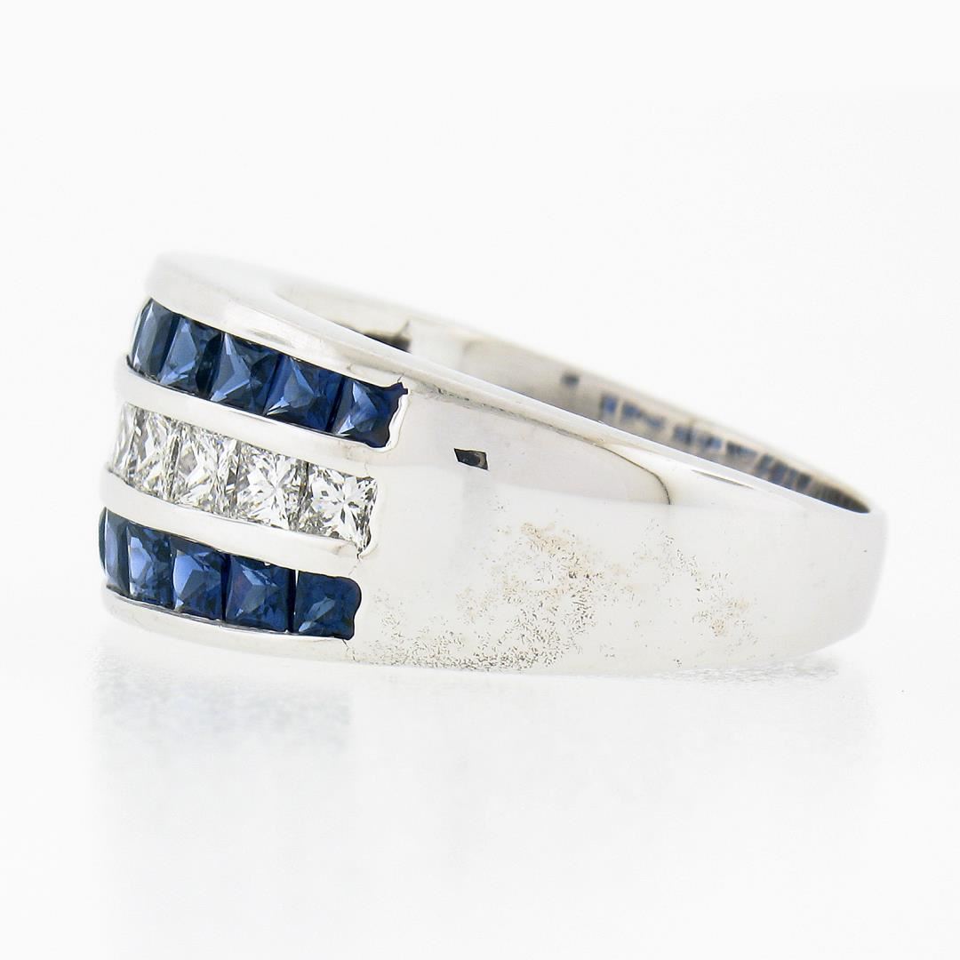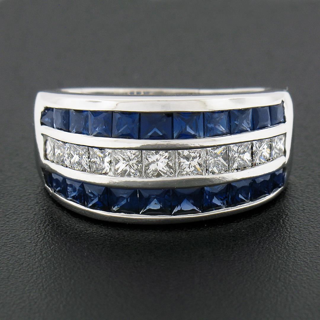 A solid 18k white gold band ring, with 11 princess cut natural diamonds (F/G - VS1/VS2 ; 1.0ctw), and 22 Square cut natural sapphires ( 2.20ctw ). The ring is size 7.5, weighs a total of 12.32 grams, and measures 10.8mm wide.