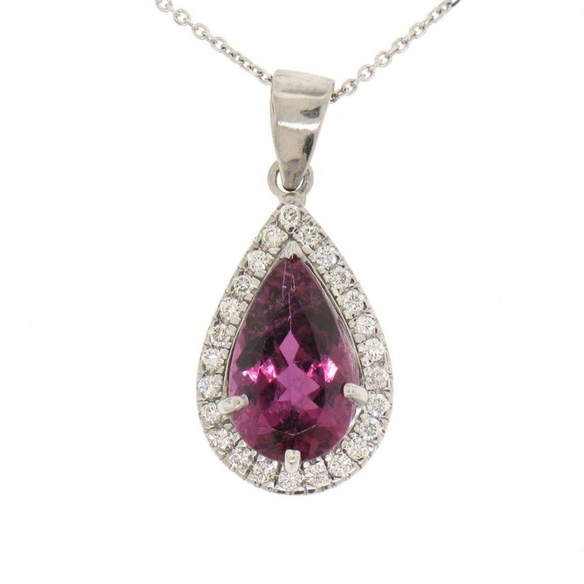 One 18k White Gold 4.20ctw Pear Shaped Rubellite Tourmaline Pendant w/ Diamond Halo. Item Details: Material: Pendant: Solid 18k White Gold, Chain: Solid 14k White Gold, Weight: 6.0 Grams, Stone(s): (1) Natural Genuine Rubellite Tourmaline - Pear Cut - Prong Set - Deep Rich Pinkish Purple Color - 14.5x8.71mm / 3.82ct (approx.), (25) Natural Genuine Diamonds - Round Brilliant Cut - Pavé Set - VS2 Clarity - G Color - 0.38ctw (approx.), Total Carat Weight: 4.20 (approx.), Chain Type: Cable Link, Chain Length: 18 Inches, Clasp: Lobster Claw, Width: 13.75mm, Height (w/ Bail): 29.75mm, Thickness: 7.15mm, Bail (Inside): 5.50x3.35mm, Condition: New w/o Tag