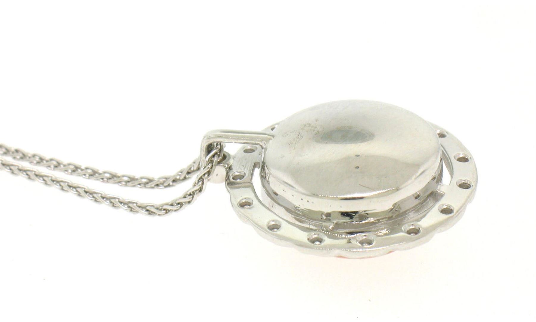 18k White Gold 7.59ctw Peach Orange Bezel NATURAL Moonstone Diamond Halo Pendant. Please see photos and description for all available information. An estate solid 18k white gold pendant necklace, featuring 1 rounf cabochon cut natural moonstone (14mm in diameter - 7.29ct), with a halo of 16 round brilliant cut natural diamonds (E - VS1; 30ctw). The pendant weighs a total of 10.80 grams, measures 20mm in diameter, 18 inch wheat link chain.