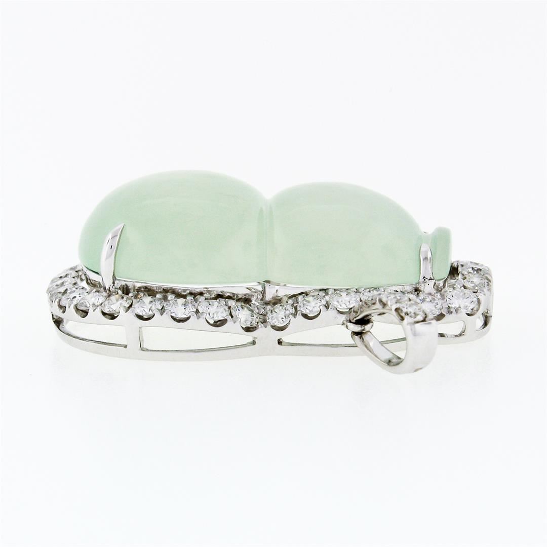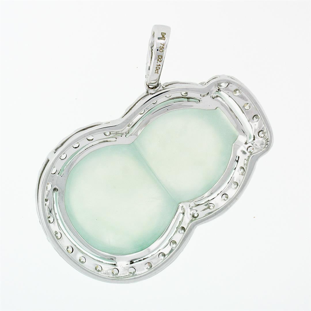 An estate solid 18k white gold pendant, with 1 AGL certified Natural Genuine Jadeite Jade (28.75 x 17.82 x 8.10 mm), and 39 round brilliant cut natural diamonds (E/F - VS1/VS2 ; 2.10ctw). The pendant weighs a total of 12.67 grams, measures 35.96x33.60mm including the bail, and the inside of the bail measures 5.80x3.40mm. Comes with all original relevant certifications.