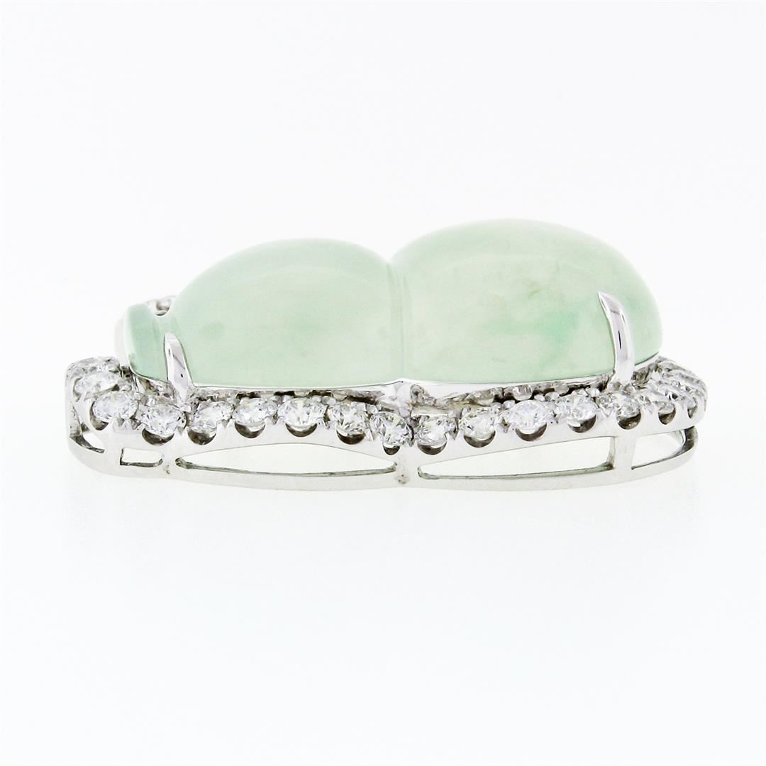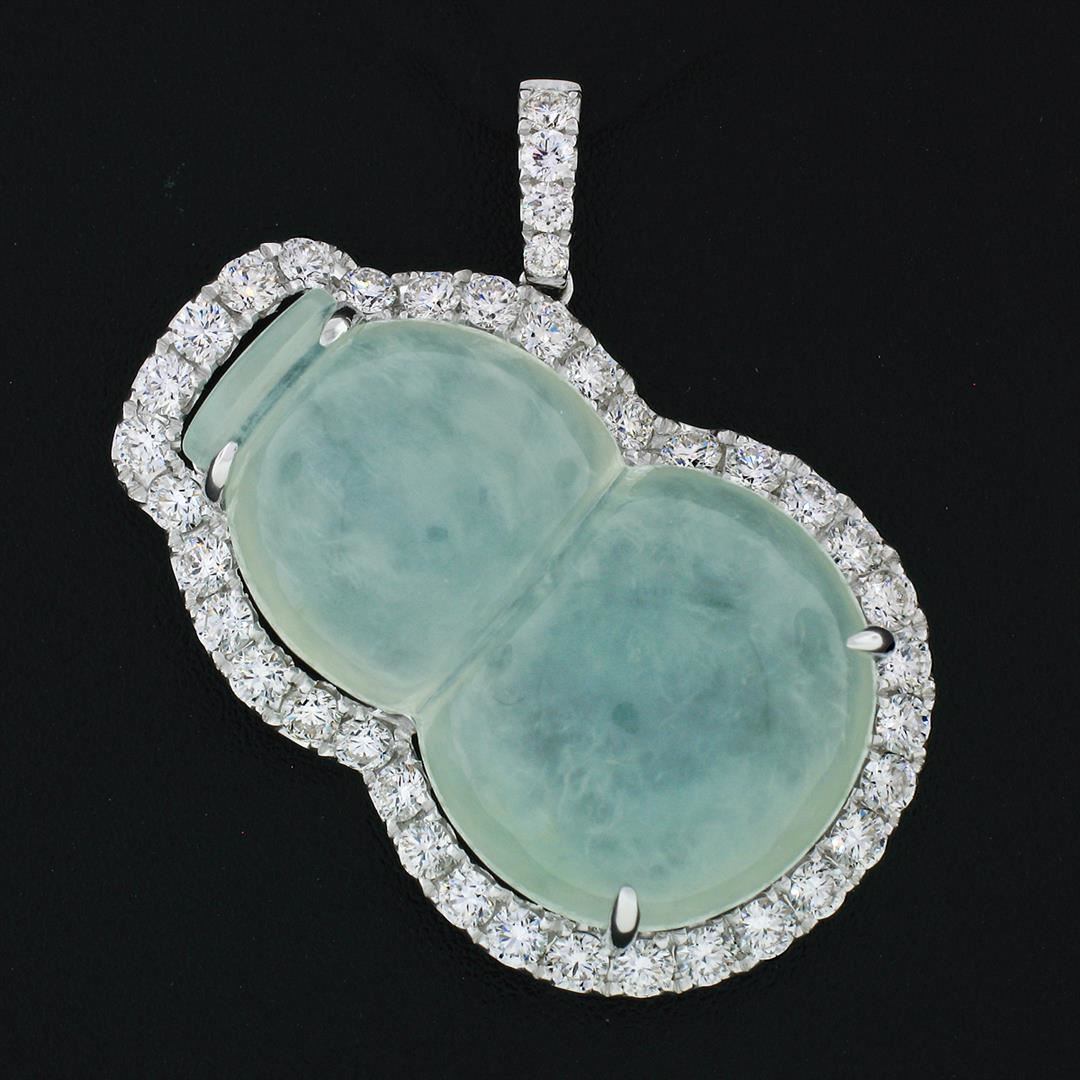 An estate solid 18k white gold pendant, with 1 AGL certified Natural Genuine Jadeite Jade (28.75 x 17.82 x 8.10 mm), and 39 round brilliant cut natural diamonds (E/F - VS1/VS2 ; 2.10ctw). The pendant weighs a total of 12.67 grams, measures 35.96x33.60mm including the bail, and the inside of the bail measures 5.80x3.40mm. Comes with all original relevant certifications.