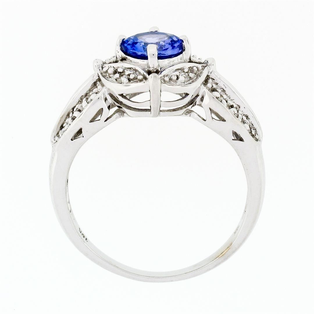An estate solid 18k white gold ring, with 1 round brilliant cut natural tanzanite (0.78ct), and 16 round brilliant cut natural diamonds (G/H - VS2 ; 0.16ctw). The ring is size 7.0, weighs a total of 5.55 grams, and measures 11.7mm wide.