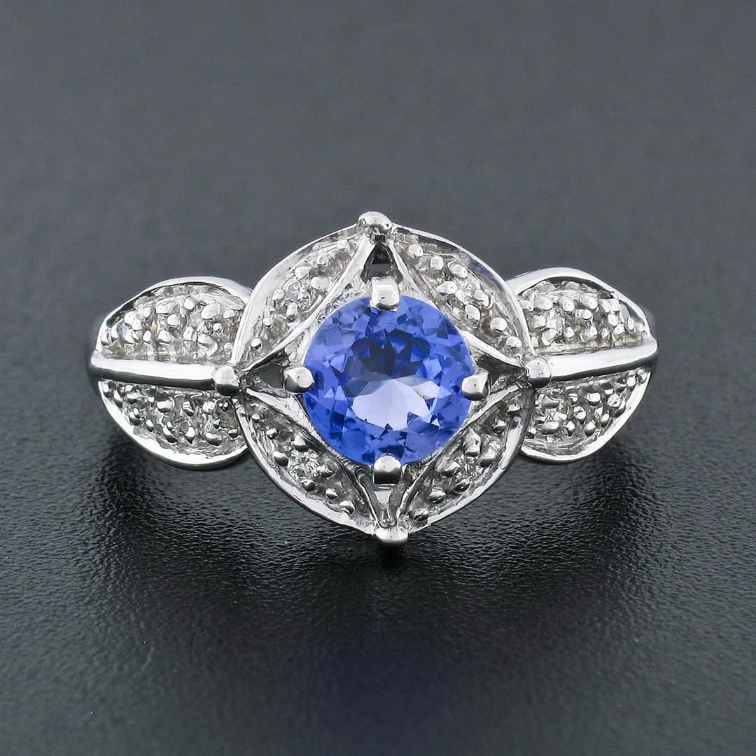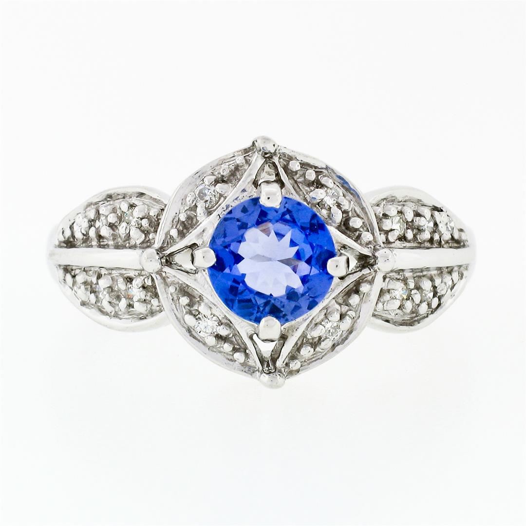 An estate solid 18k white gold ring, with 1 round brilliant cut natural tanzanite (0.78ct), and 16 round brilliant cut natural diamonds (G/H - VS2 ; 0.16ctw). The ring is size 7.0, weighs a total of 5.55 grams, and measures 11.7mm wide.