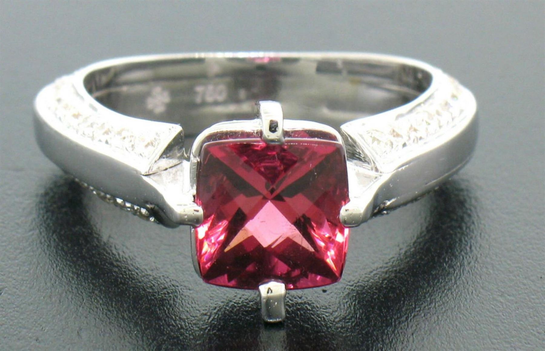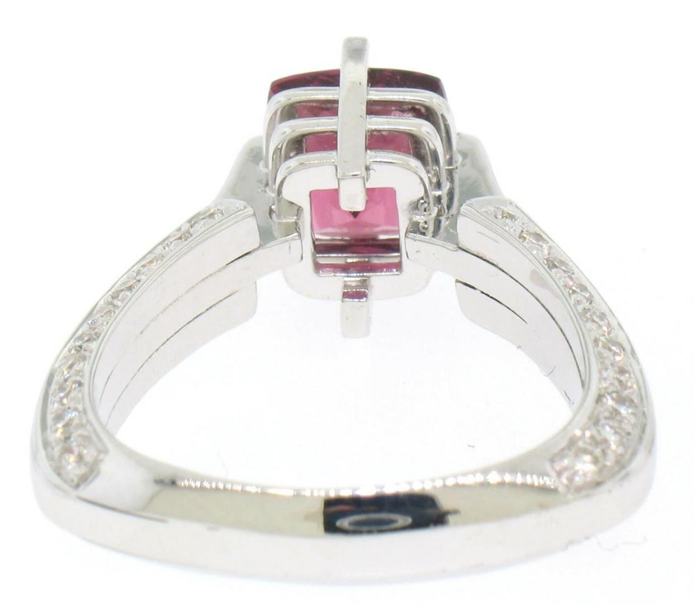 One 18K Solid White Gold Rubellite Tourmaline Dinner Ring With Pave Set Round Brilliant Diamonds. Item Details: Material: 18K Solid White Gold , Weight: 9.90 Grams , Stone(s): (1) Natural Genuine Cushion Cut Rubellite Tourmaline - Clear Burgundy Color - 7.65x10.45mm - 2.50ct , (40) Natural Genuine Round Brilliant Diamonds - F Color - VS2 Clarity - 0.79ctw, Size: 8.0, Width: 10.45mm at the center stone - 5.57mm at the shank, Height: 8.66mm rise off the finger, Condition: New