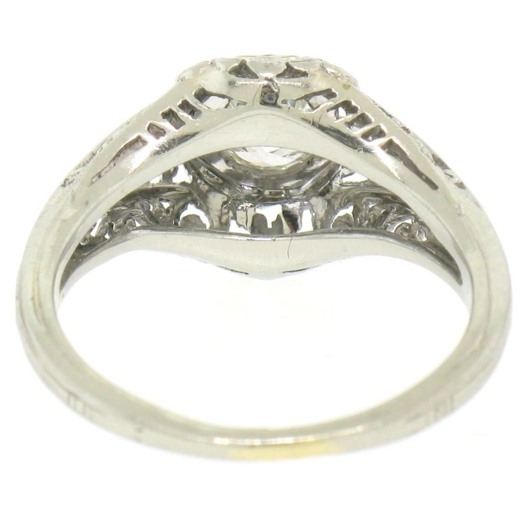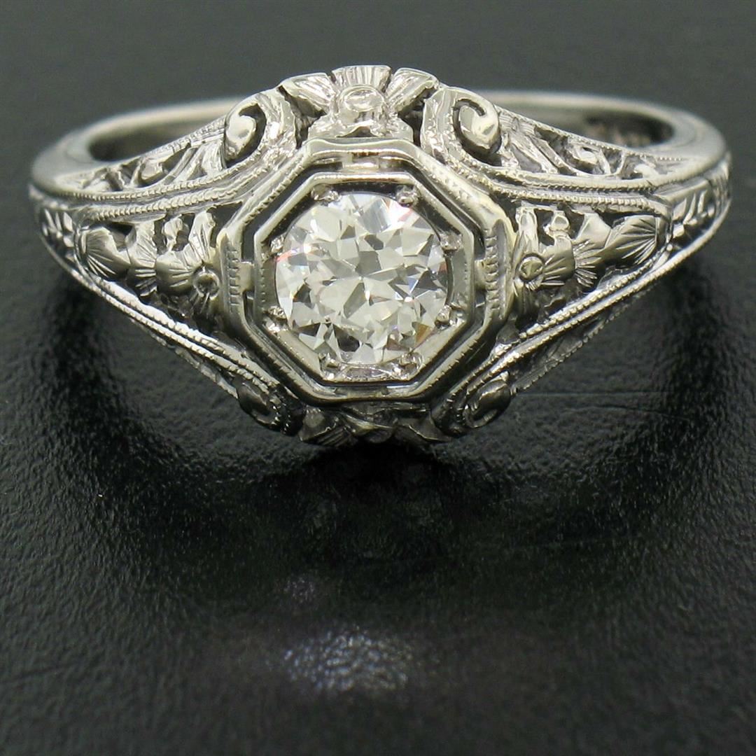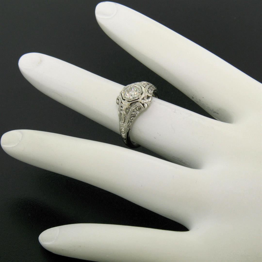 One Antique Art Deco Belais 18k White Gold Filigree 0.41ct European Cut Diamond Ring. Item Details: Material: 18K Solid White Gold, Weight: 2.6 Grams, Stone(s): (1) Natural Genuine Diamond - Old European Cut - Bead Set - E Color - VVS2 Clarity - 0.41ct (approx.), Ring Size: 4.0 (We can custom size this ring.), Ring Width: 9.90mm, Ring Height: 5.21mm rise off the finger, Condition: Antique ring in ALL ORIGINAL, MINT condition!, Signature: 18K Belais