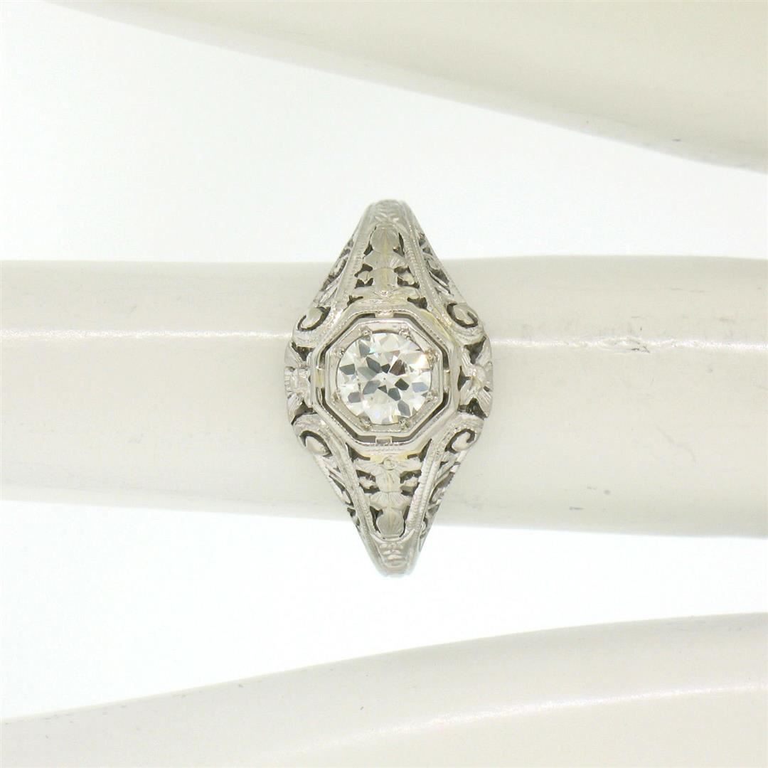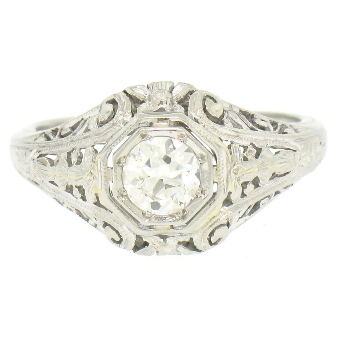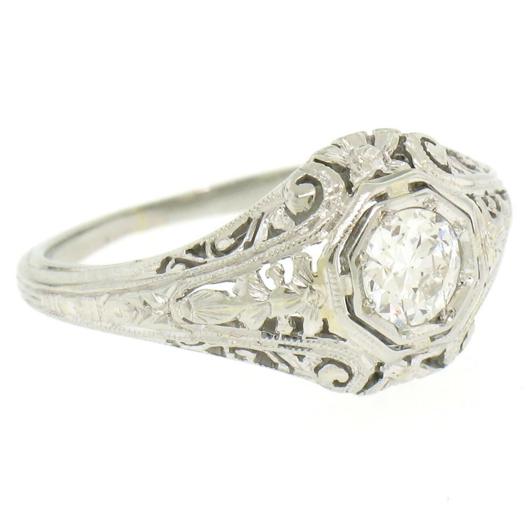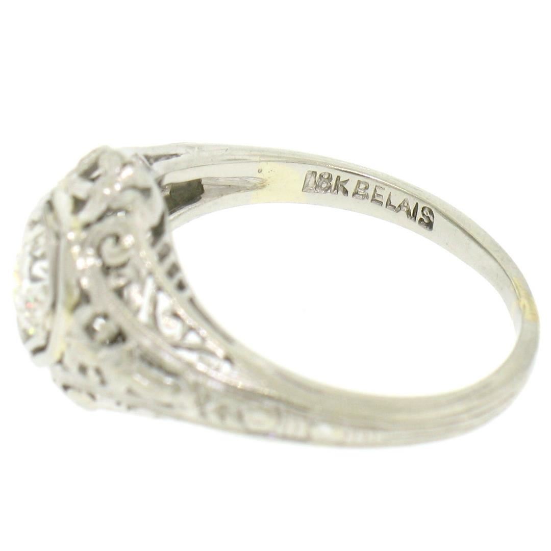 One Antique Art Deco Belais 18k White Gold Filigree 0.41ct European Cut Diamond Ring. Item Details: Material: 18K Solid White Gold, Weight: 2.6 Grams, Stone(s): (1) Natural Genuine Diamond - Old European Cut - Bead Set - E Color - VVS2 Clarity - 0.41ct (approx.), Ring Size: 4.0 (We can custom size this ring.), Ring Width: 9.90mm, Ring Height: 5.21mm rise off the finger, Condition: Antique ring in ALL ORIGINAL, MINT condition!, Signature: 18K Belais