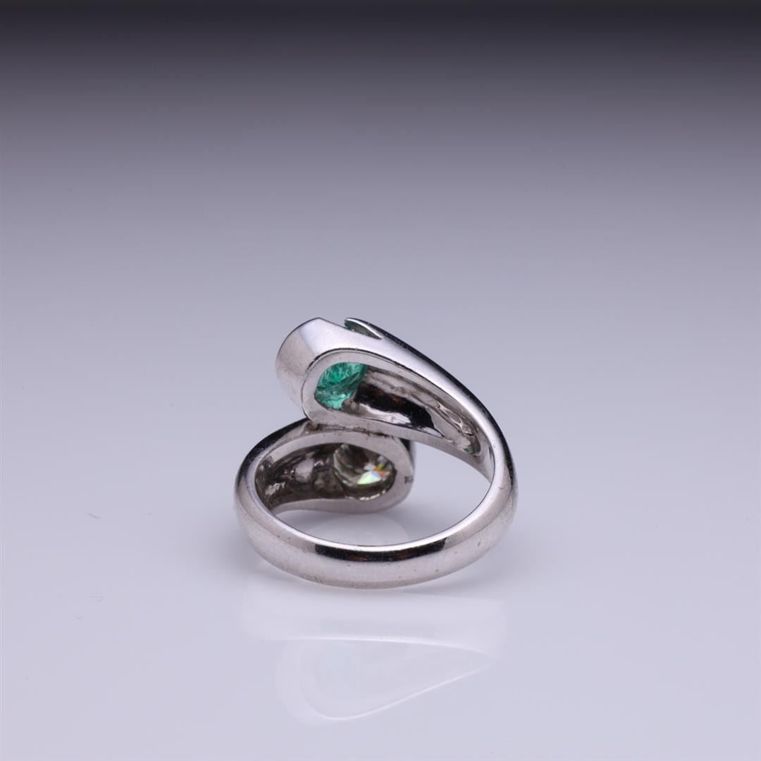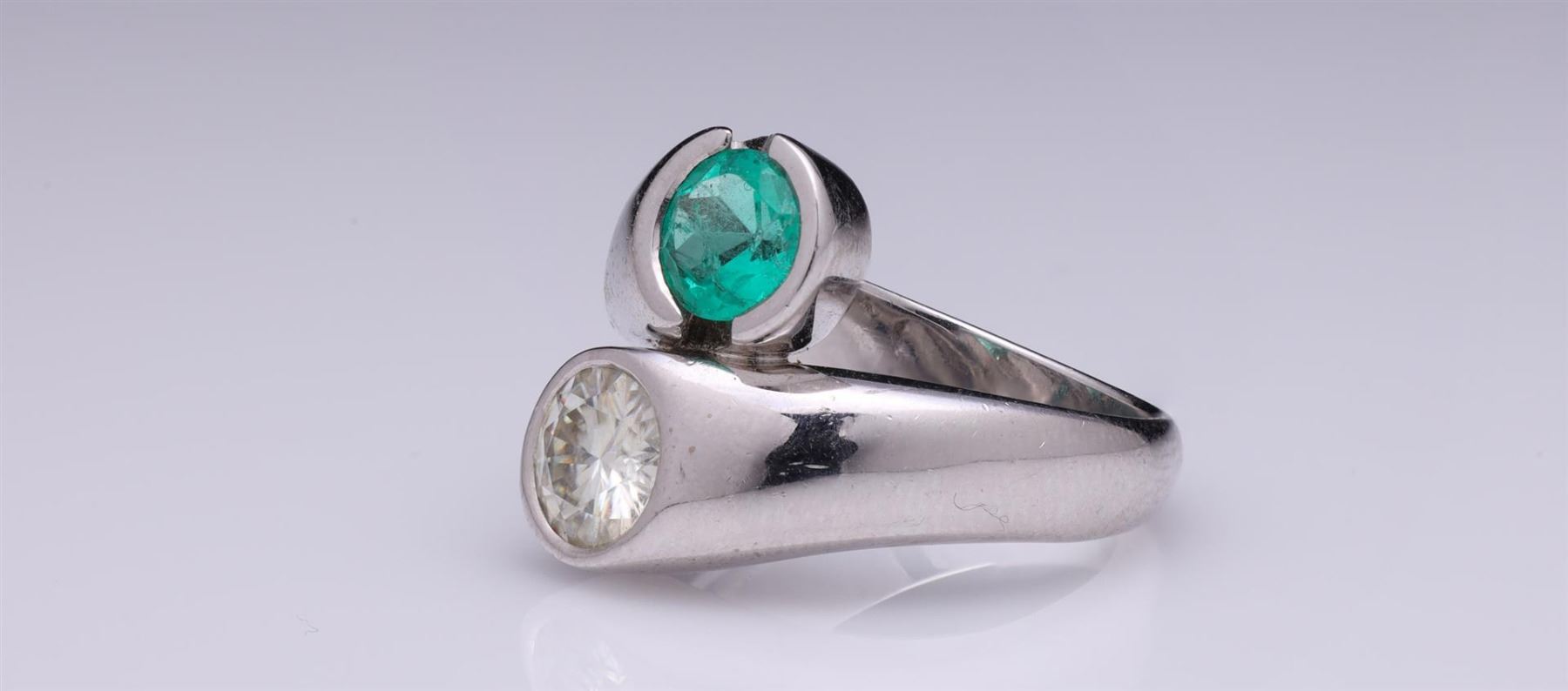 18k white gold crossover ring by Carlo Rici, a round cut bezel set moissanite twinned with a similar sized bright green emerald in split bezel setting, marked CR750; gross weight 12.4 g, size 7