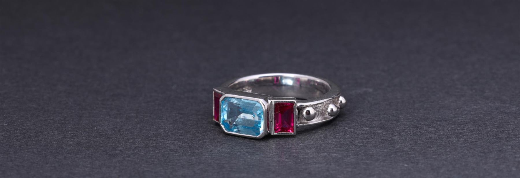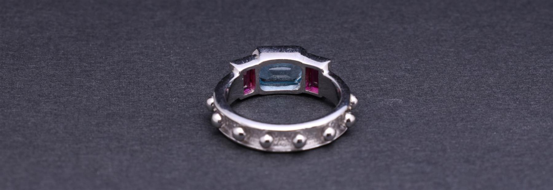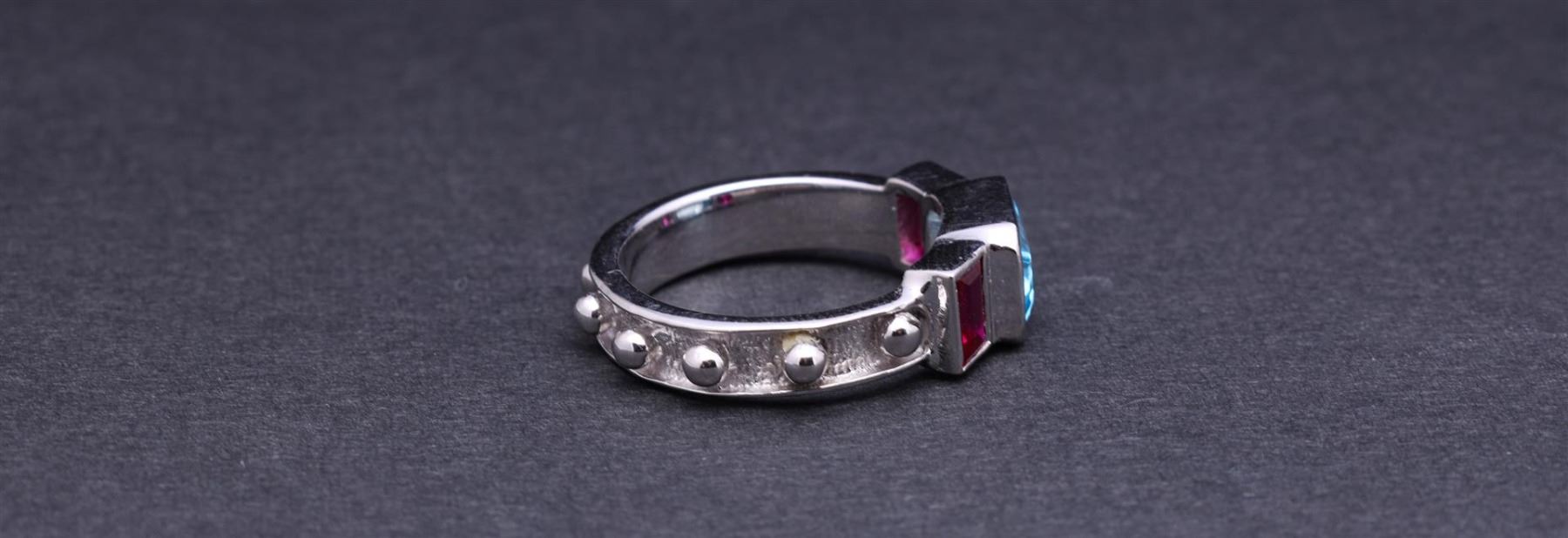 18k White Gold Ring by Carlo Rici containing one emerald cut blue topaz weighing approximately 1.6 cts and two rubies weighing approximately 0.72 cts Total weight is 5.8 gm. Estimated retail value $1,700.