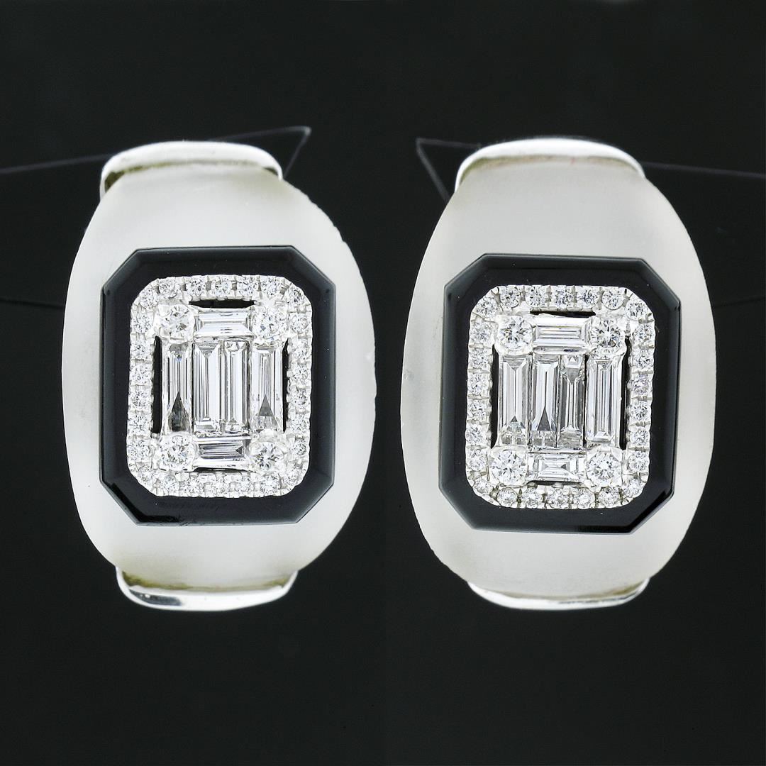 A solid 18k white gold button earrings, with 2 natural rock crystal (21.2x14.75mm each ), 2 custom cut natural black onyx (13.2x11.2mm), 62 round brilliant cut & 12 straight baguette cut natrual diamonds (F/G - VS1/VS2 ; 1.82ctw). The earrings measure approximately 23.2x14.75mm and weigh a total of 15.60 grams.