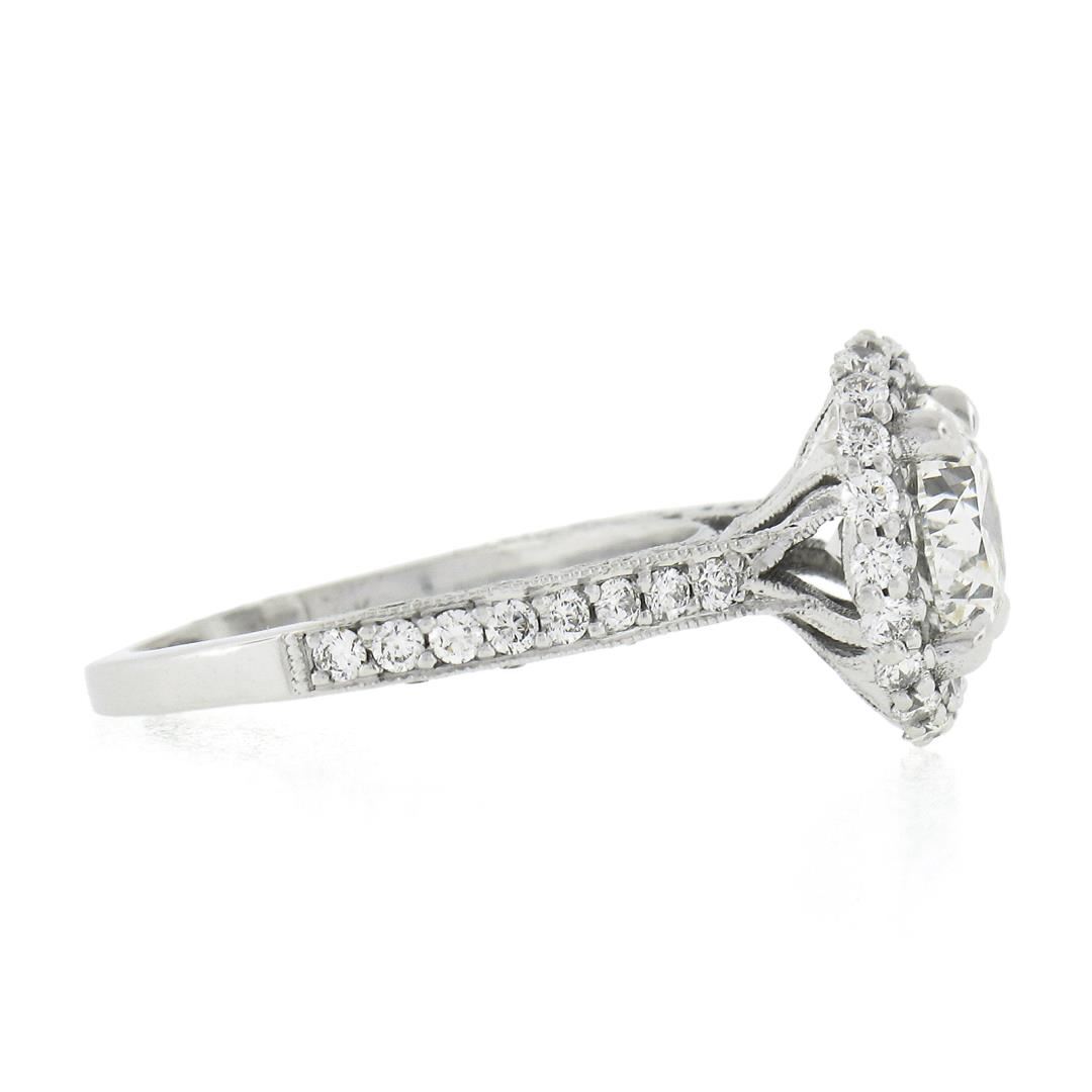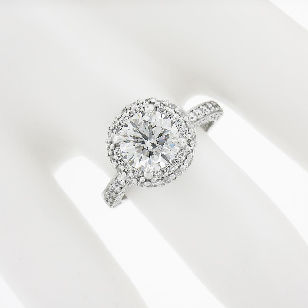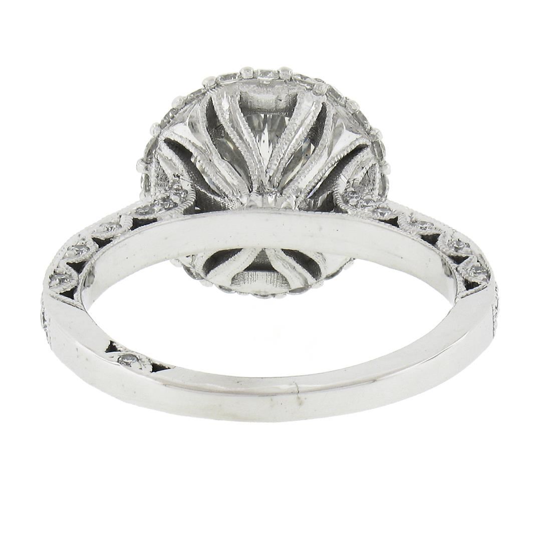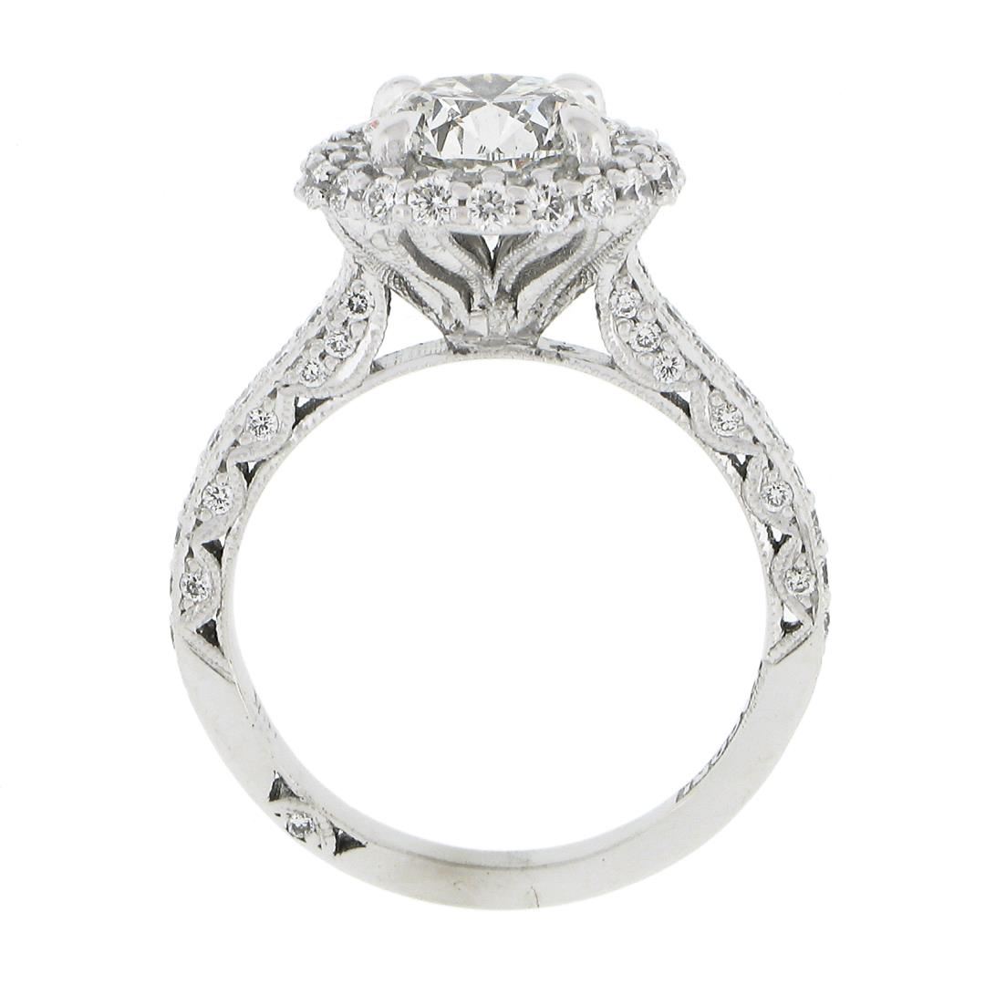 A solid 18k white gold engagement ring by Tacori, with 1 GIA graded 1 round cut natural diamond (H- SI1 ; 1.71ct ), and 78 round cut natural diamonds (G/H - VS1/VS2 ; 0.80ctw). The ring is size 5.5, weighs a total of 4.55 grams, and measures 11.7mm wide. Comes with all original relevant certifications.