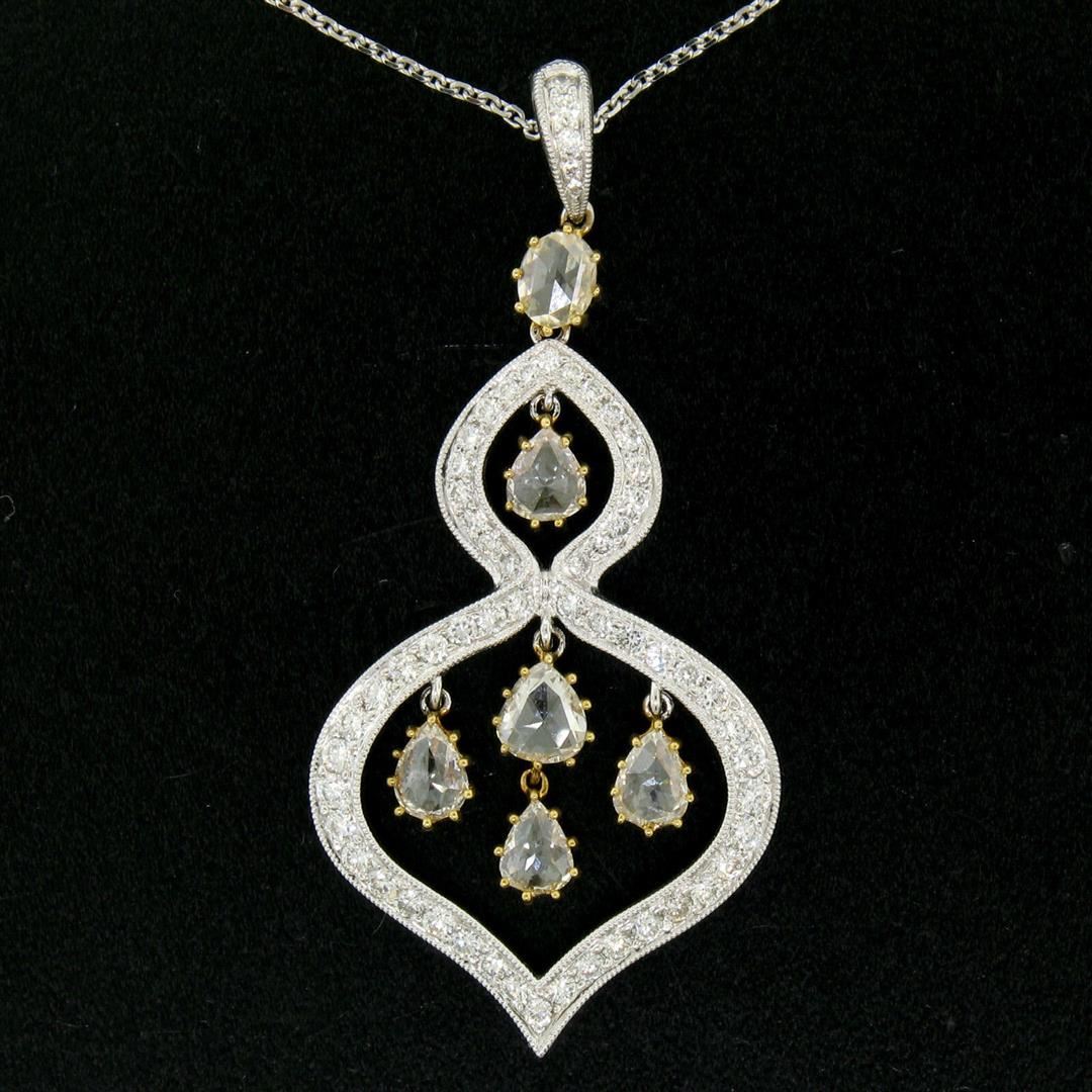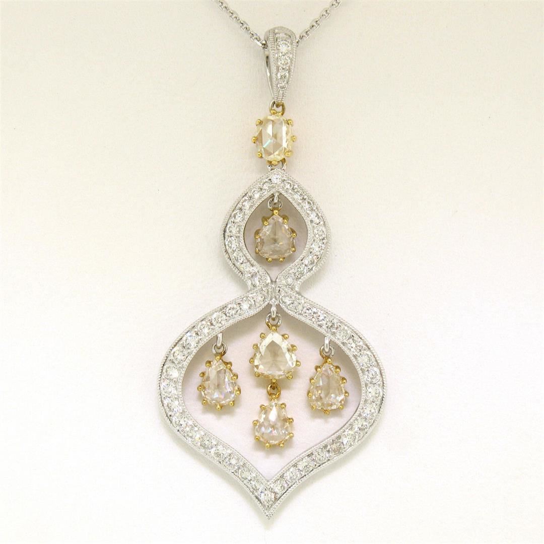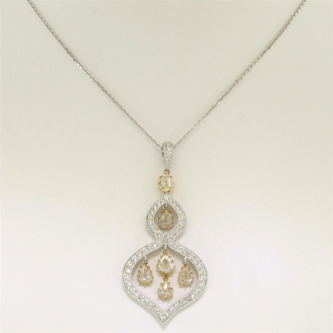 A like new 18k gold pendant featuring 0.70ctw of round diamonds (F - VS1/VS2) pave set into white gold and 1.40ctw of rose cut diamonds (Faint Yellow/Fancy Light Yellow - VS1/VS2) prong set into yellow gold. 18k white gold 18 inch cable link chain, 7.04 grams total weight, measures 38.88x22.36mm.