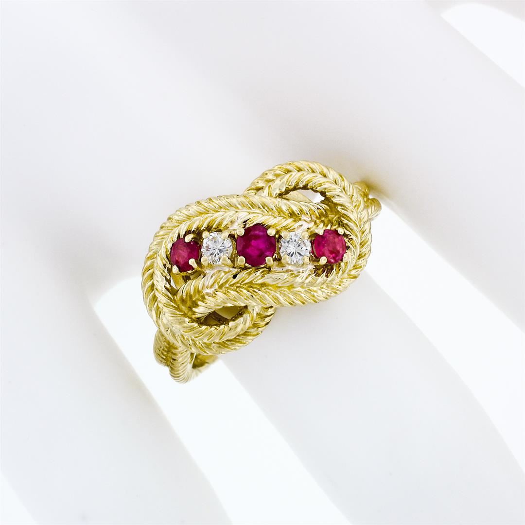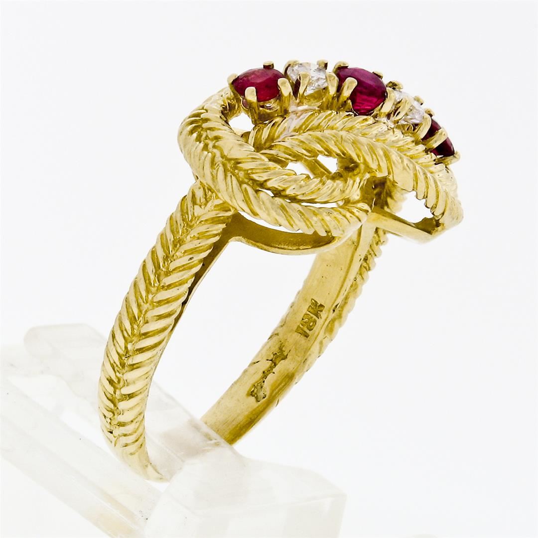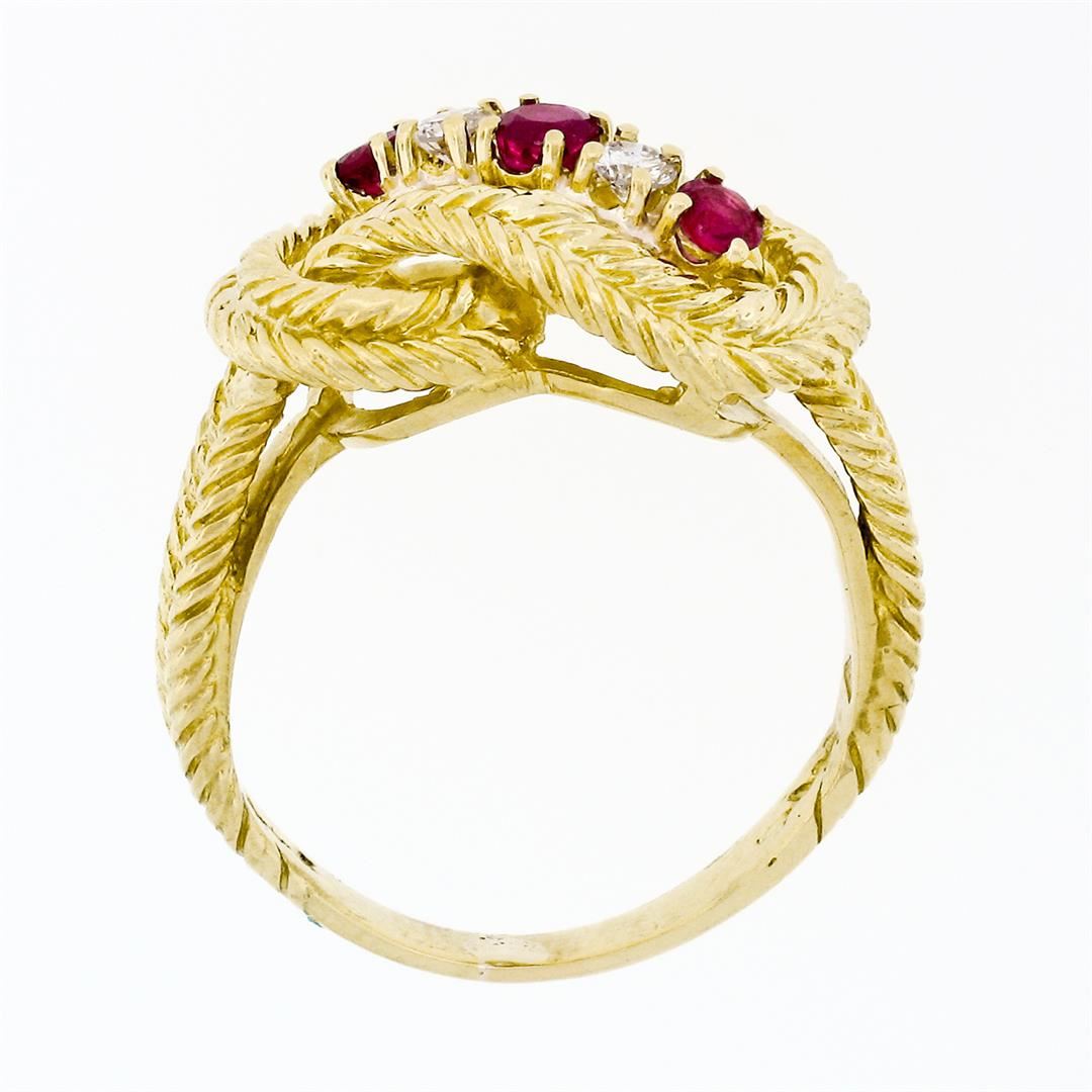 An estate solid 18k yellow gold braided knot ring, with 3 round cut natural rubies (0.38ctw), and 2 round brilliant cut natural diamonds (G - VS2 ; 0.12ctw). The ring is size 9, weighs a total of 7.34 grams, and measures 11.95mm wide.