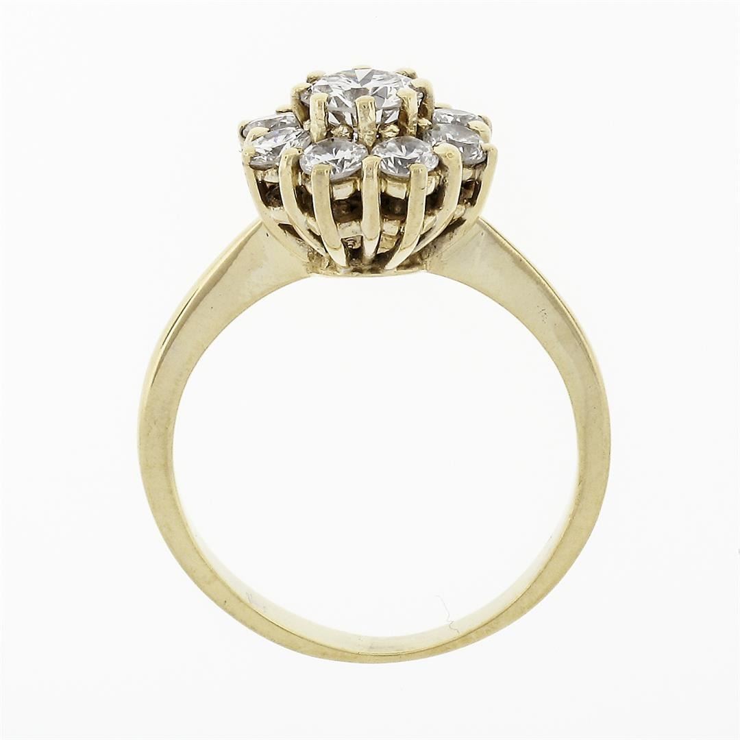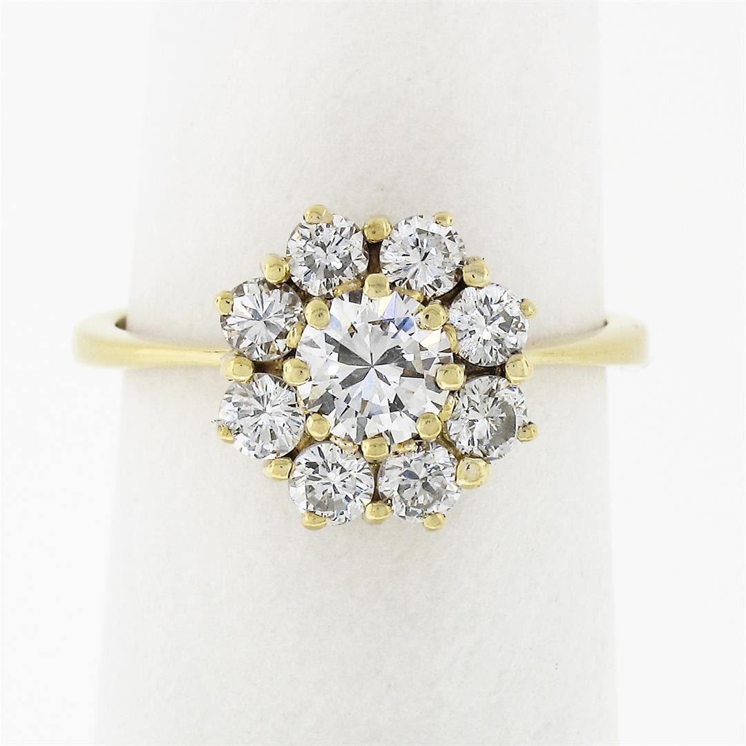 A solid 18k yellow gold flower cluster ring, with 9 round brilliabnt cut natural diamonds (F- VVS2/VS1 ; 0.93ctw). The ring is size 5, weighs a total of 3.39 grams, and measures 10mm wide.