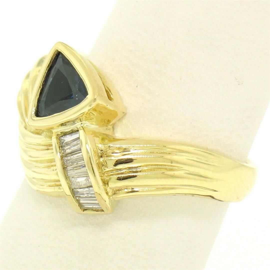 An 18k yellow gold cocktail ring featuring a bezel set trillion cut blue sapphire (0.80ct) accented by 8 channel set baguette cut diamonds (G/H - SI1/SI2; 1.04ctw). The ring is size 7, weighs a total of 8.60 grams, and measures 13.5mm wide.