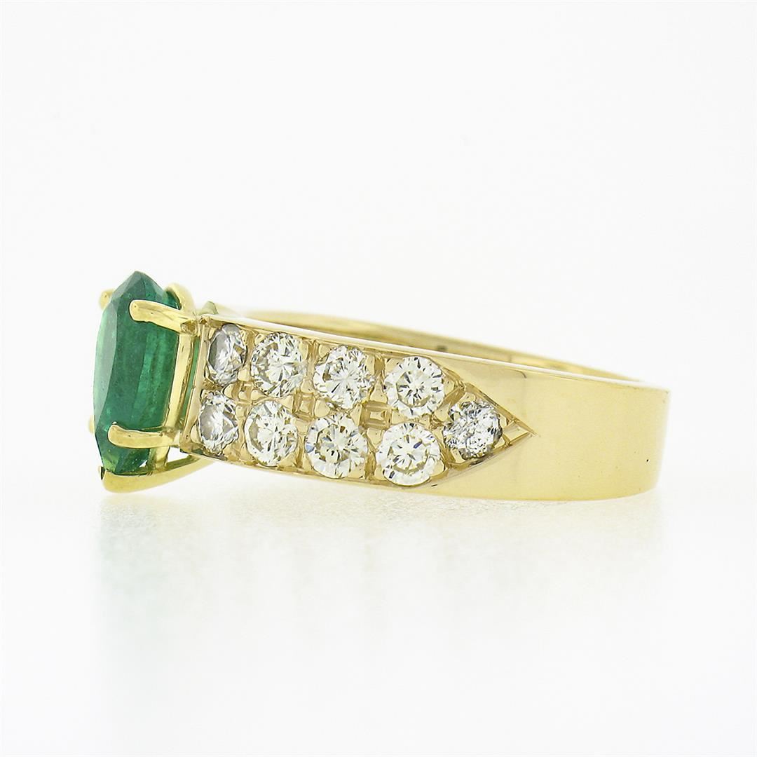 A solid 18k yellow gold engagement ring, with 1 pead cut natural emerald (9.1x6.35mm - 1.80ct), and 18 round brilliant cut natural diamonds (H/I - VS2/SI1 ; 1.26ctw). The ring is size 7.5, weighs a total of 8.0 grams, and measures 9.85mm wide.