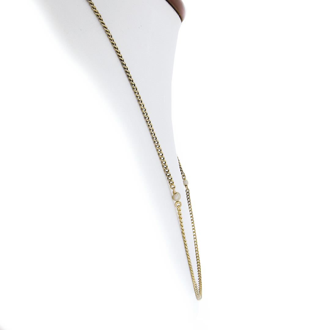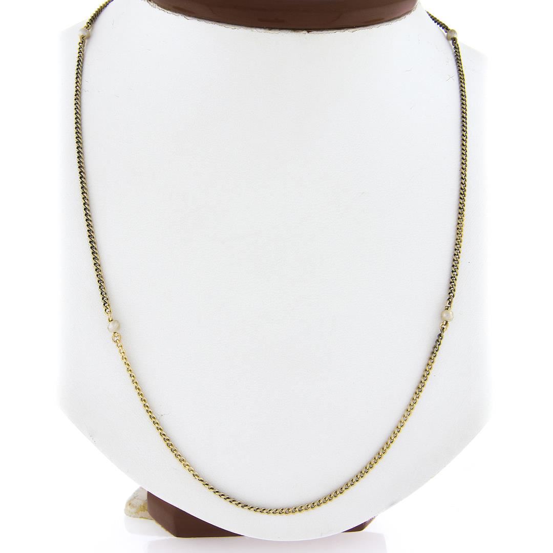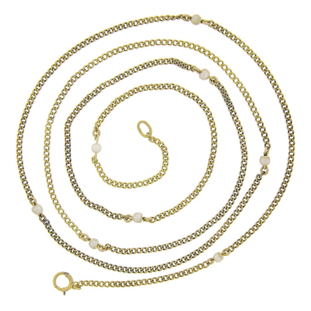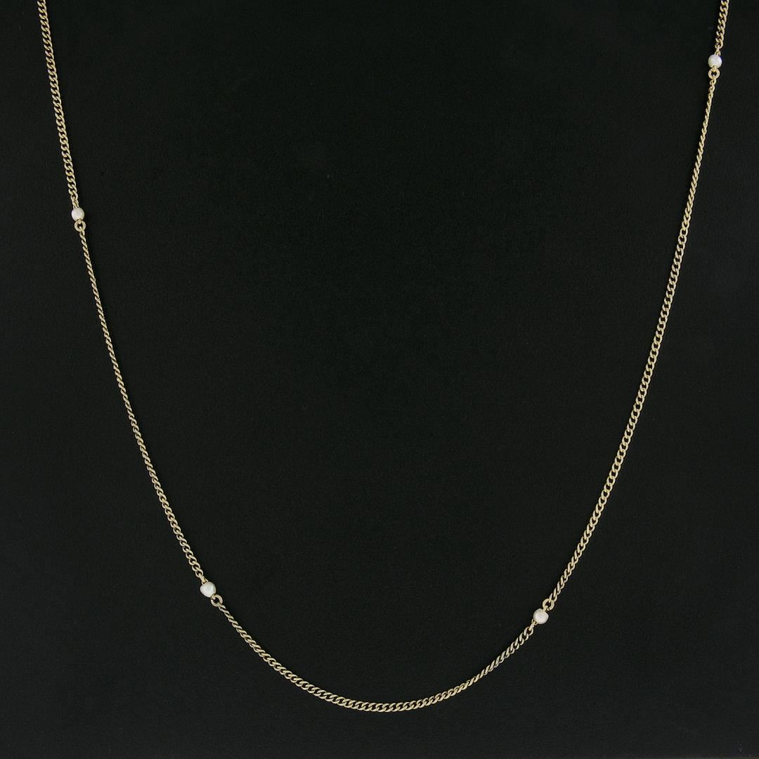 A sp;od 18k yellow gold by the yard curb station necklace, with round cultured pearls (3.1mm to 3.8mm each). It weighs a total of 9.83 grams, measures 3.8mm wide, and measures 31 inches in length.