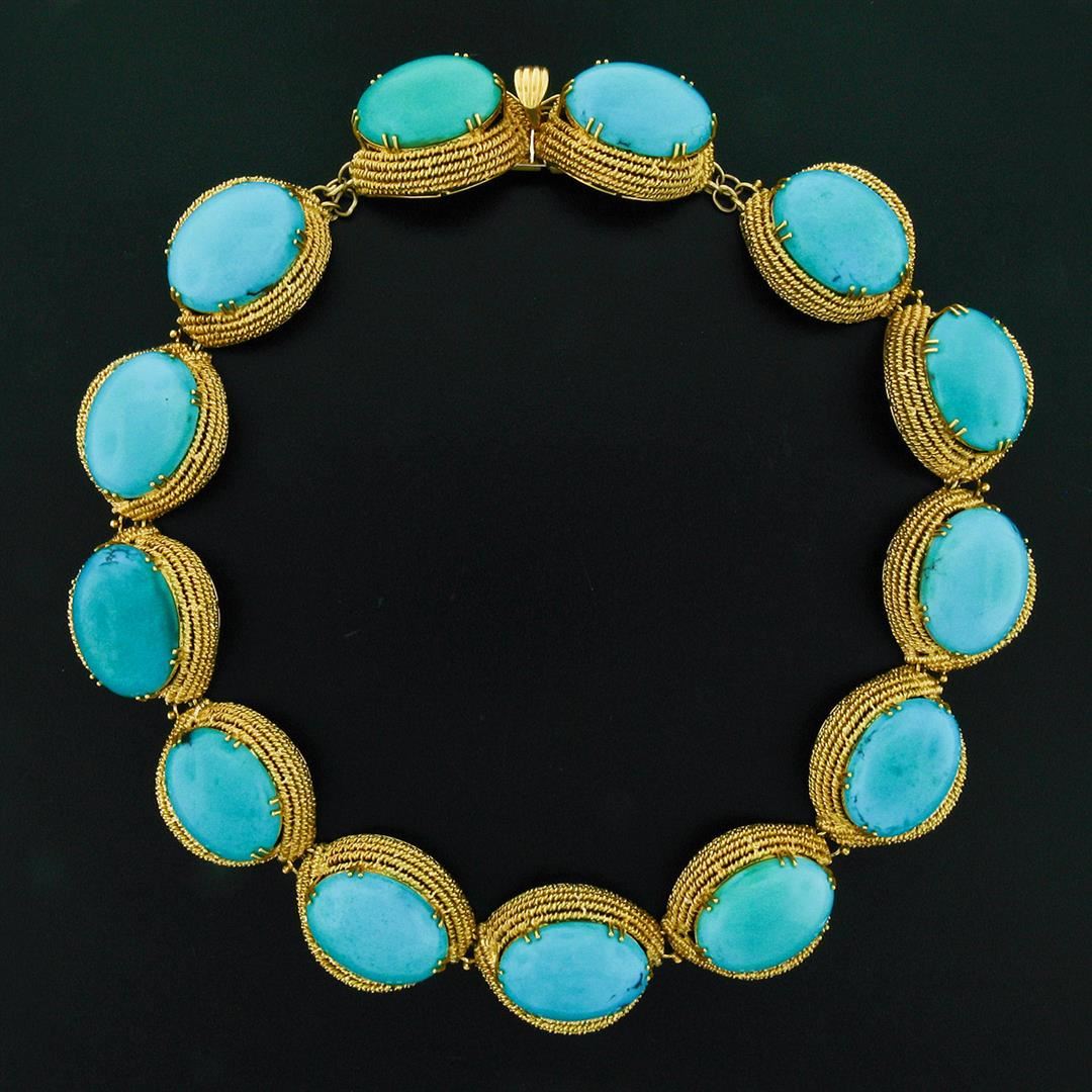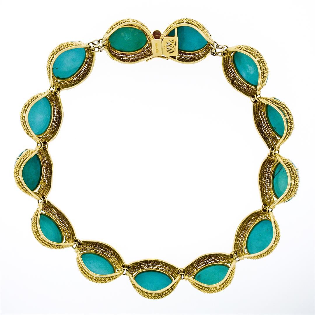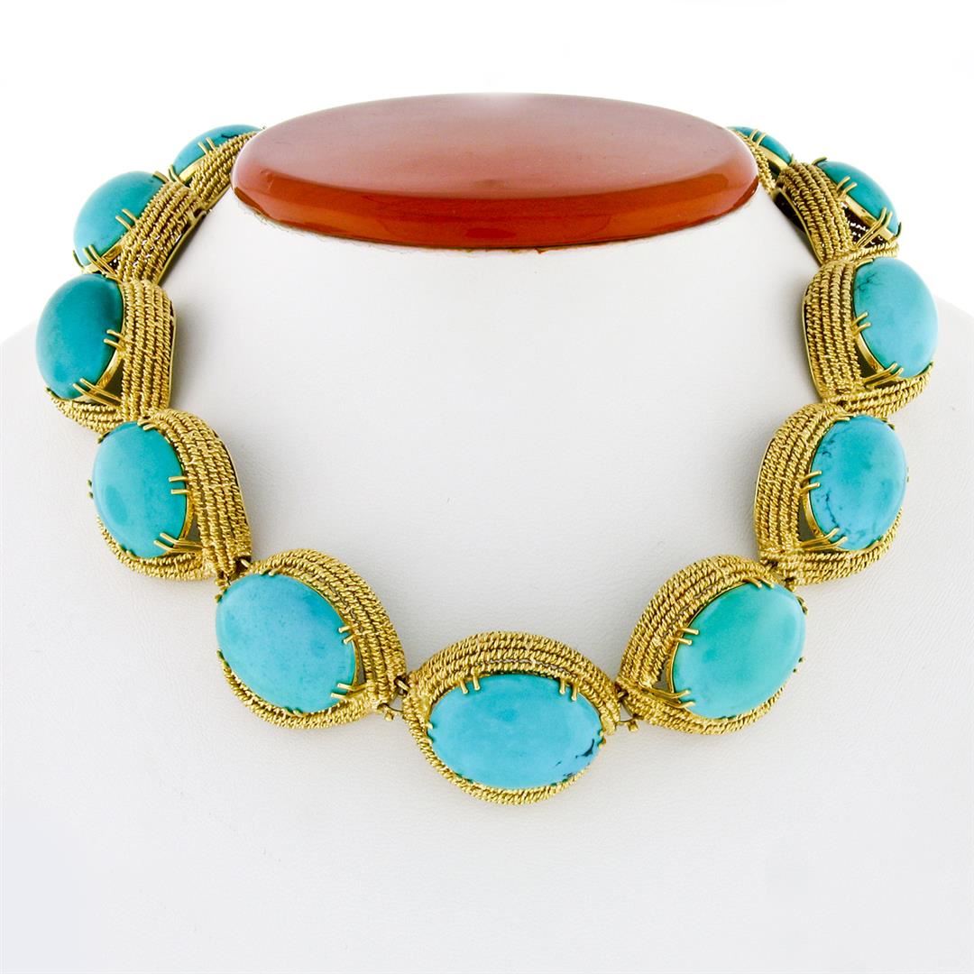One Vintage 18k Yellow Gold GIA Certified Large Cabochon Greenish Blue Turquoise Statement Necklace. Item Details - Material: Solid 18k Yellow Gold, Weight: 155.50 Grams, Stone(s): (15) Natural Genuine Turquoise - 200 carats (approx. based on GIA measurements), **See Certification Details Below**, Type: Handmade Twisted Wire Nest-Like Baskets, Length: 15 Inches, Width: 24.0mm (approximate width of each basket), Height: 28.0mm (approximate height of each basket), Condition: Vintage statement piece. Comes w/ GIA certification for the natural turquoise stones. Excellent, ready to wear condition! Certification Details - Laboratory: GIA, Report Number: 6194961680, Species: Natural Turquoise, Shape: Oval, Cutting Style: Cabochon, Transparency: Opaque, Color: Greenish Blue, Treatment: Impregnated, Measurements: 21.68 x 16.03 x 5.97 mm to 22.61 x 17.20 x 6.70 mm