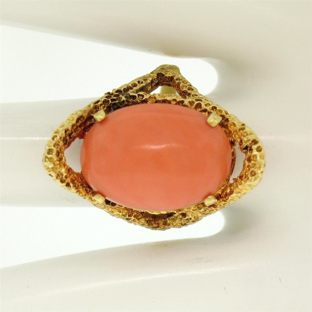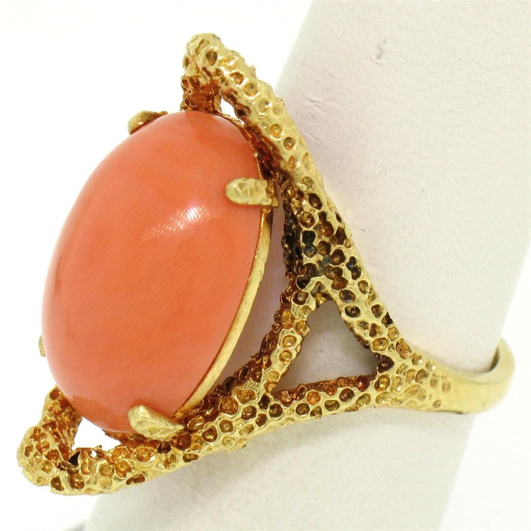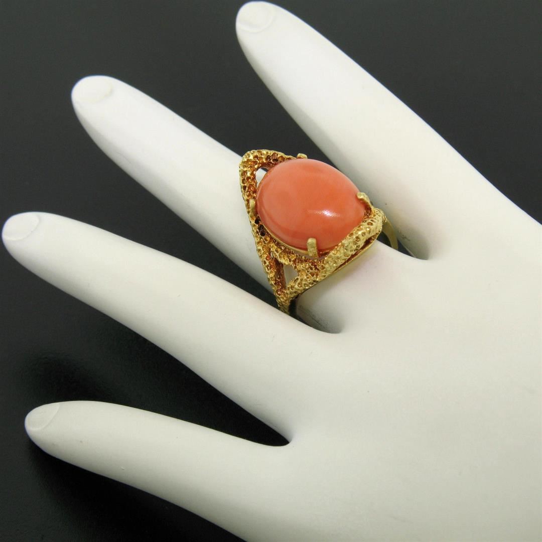 One Vintage 18k Yellow Gold Large Cabochon FINE Coral Nugget Textured Solitaire Ring. Item Details - Material: 18k Solid Yellow Gold, Weight: 9.70 Grams, Stone(s): (1) Natural Genuine Coral - Oval Cabochon Cut - Prong Set - Rich Pink/Peach Color - 18x12.5mm (approx.), Ring Size: 7.0, Ring Width: 25.5mm, Ring Height: 11.5mm rise off the finger, Condition: Vintage ring. Original patina has been preserved. Excellent condition!
