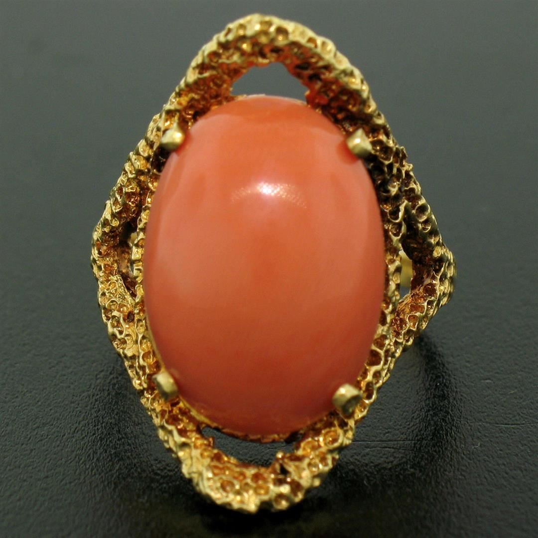 One Vintage 18k Yellow Gold Large Cabochon FINE Coral Nugget Textured Solitaire Ring. Item Details - Material: 18k Solid Yellow Gold, Weight: 9.70 Grams, Stone(s): (1) Natural Genuine Coral - Oval Cabochon Cut - Prong Set - Rich Pink/Peach Color - 18x12.5mm (approx.), Ring Size: 7.0, Ring Width: 25.5mm, Ring Height: 11.5mm rise off the finger, Condition: Vintage ring. Original patina has been preserved. Excellent condition!