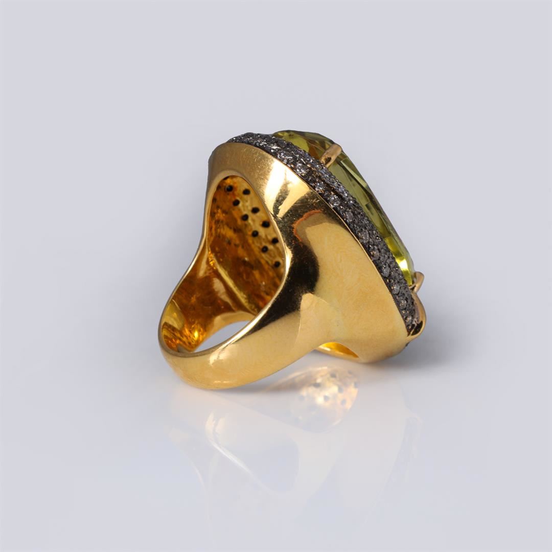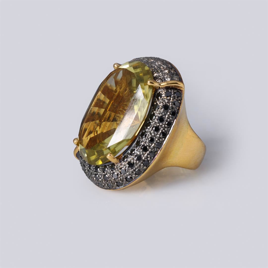 18k Yellow Gold Lemon Quartz & Black Diamond Cocktail Ring by Carlo Rici containing one oval lemon quartz 25mm x 18.5mm. Forty six round brilliant cut black diamonds weighing approximately 1.20 cts and forty-six round brilliant Champaigne diamonds weighin