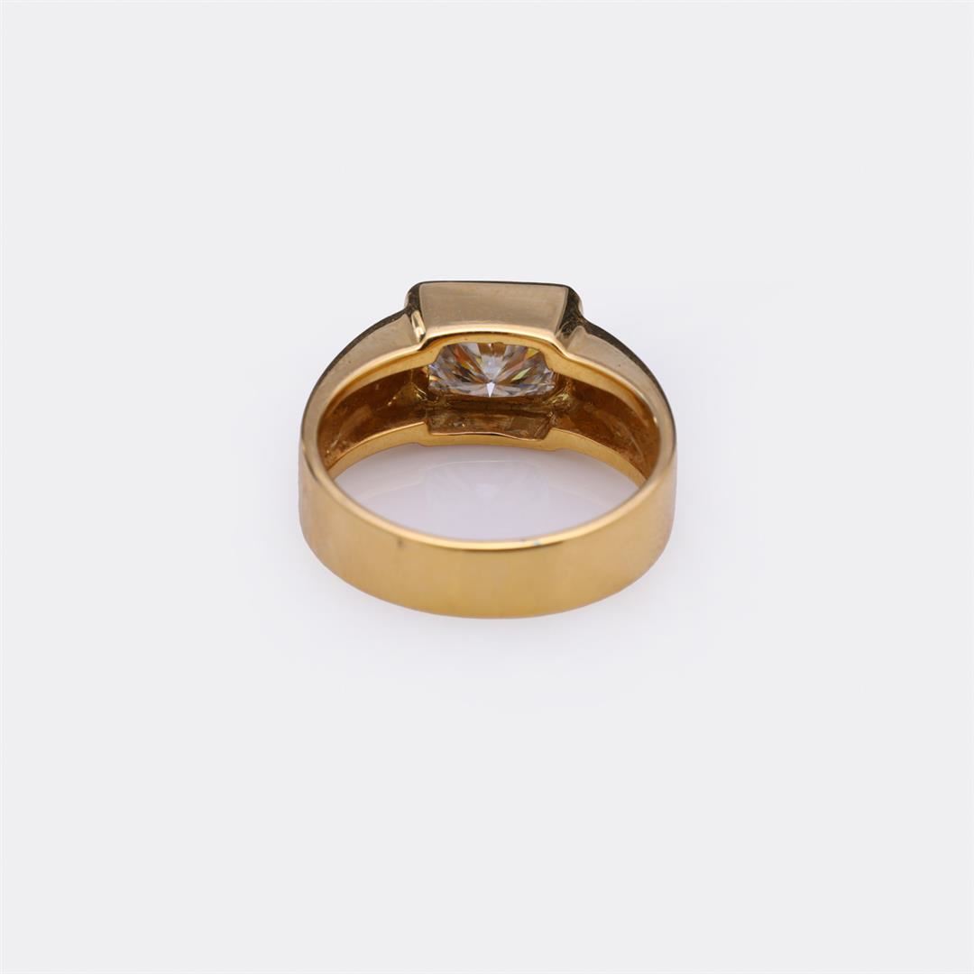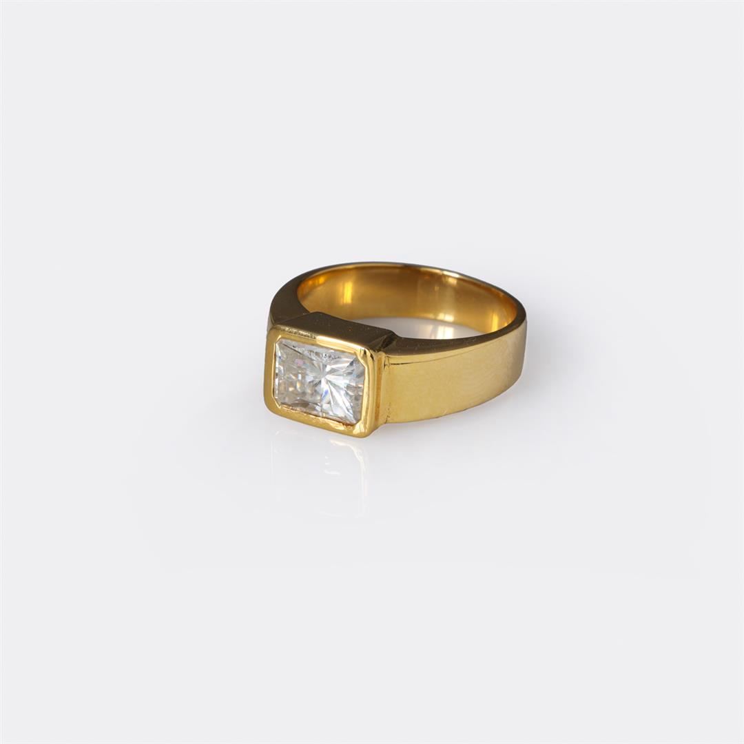 Fine 18k yellow gold ring centered with a bezel set rectangular cut moissanite, interior band marked 750; gross weight 7.5 g, size 7 1/2
