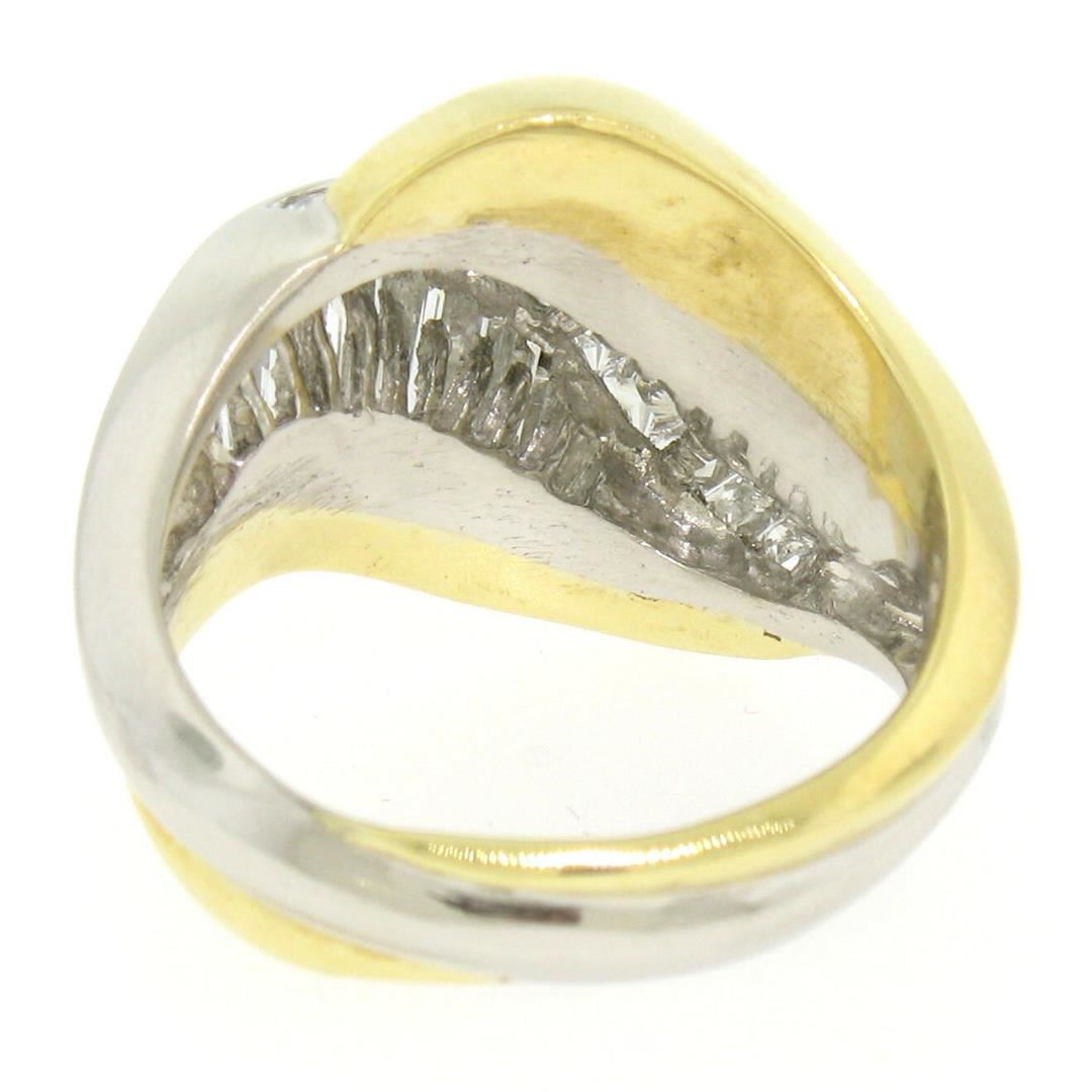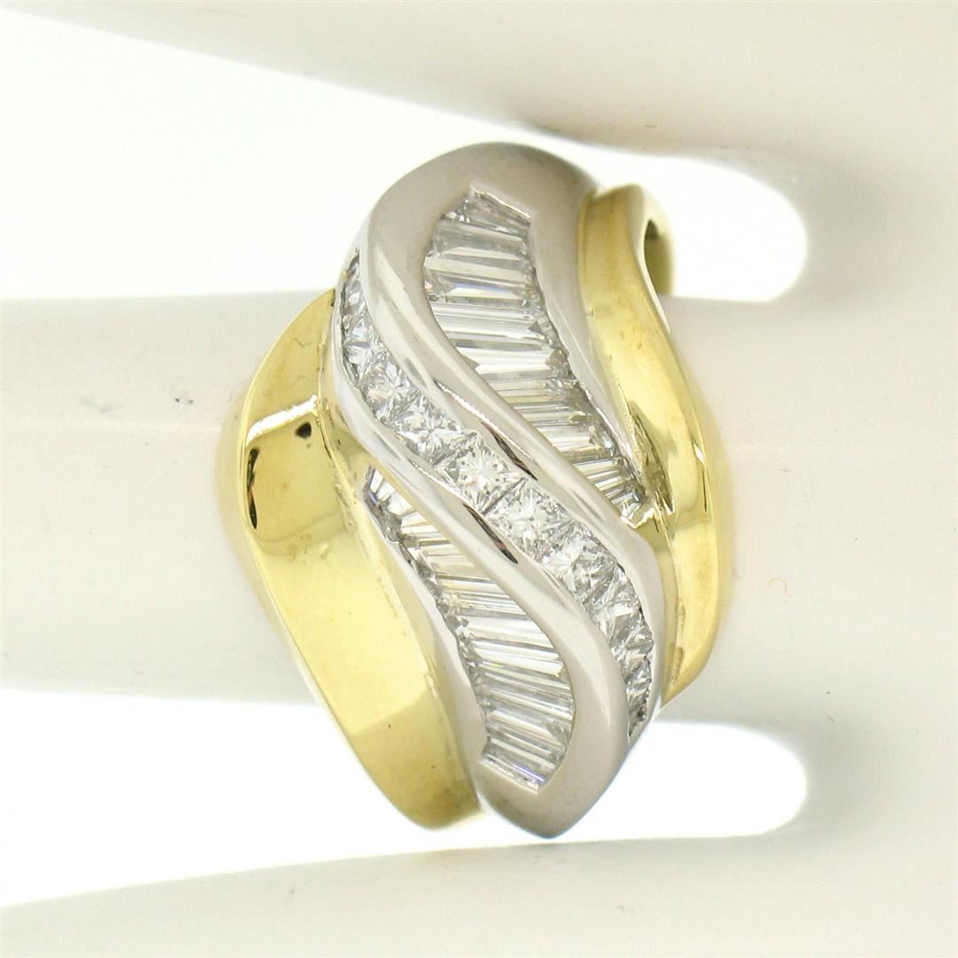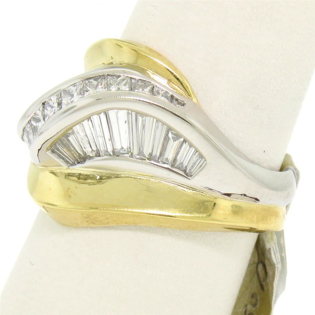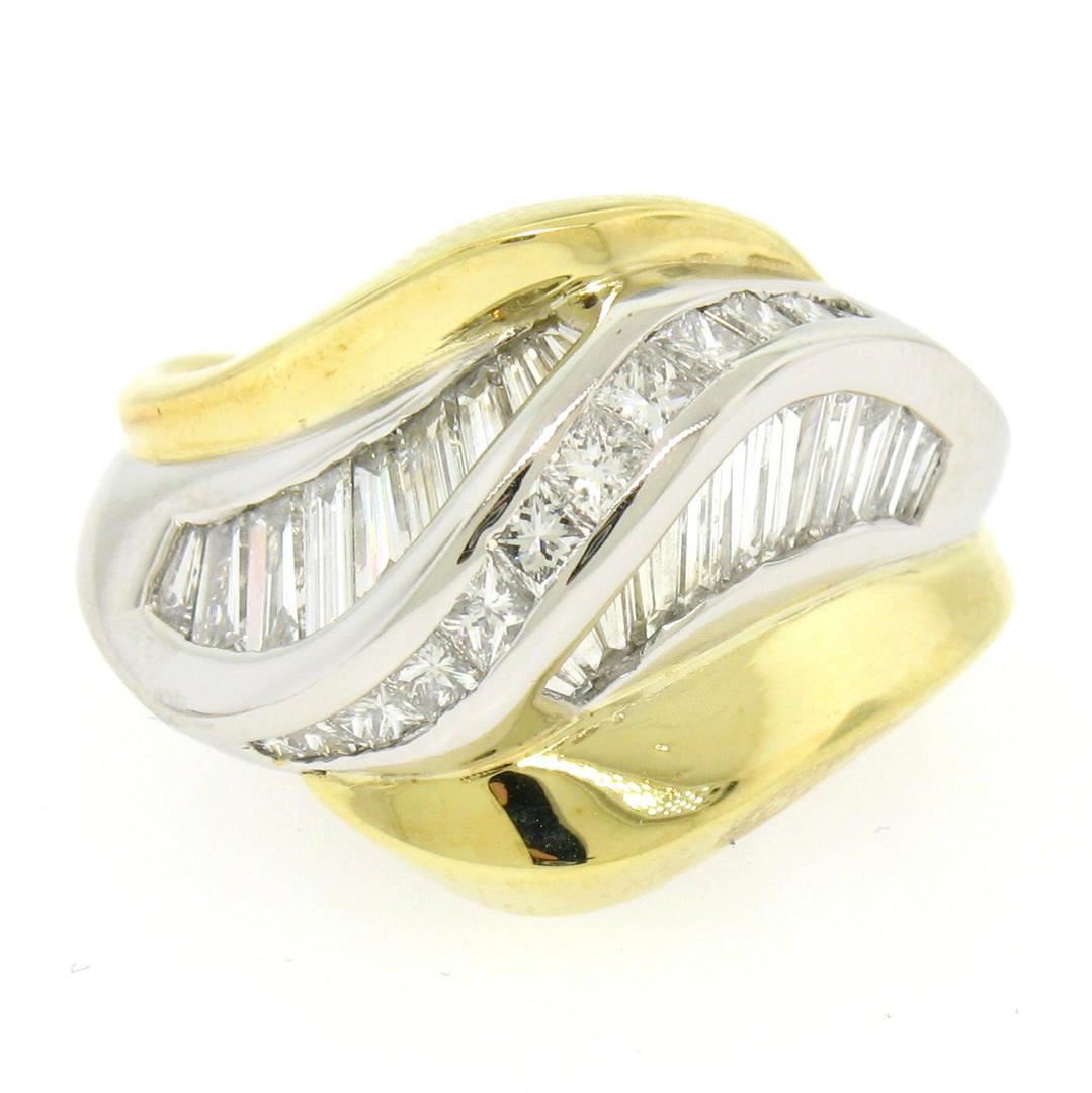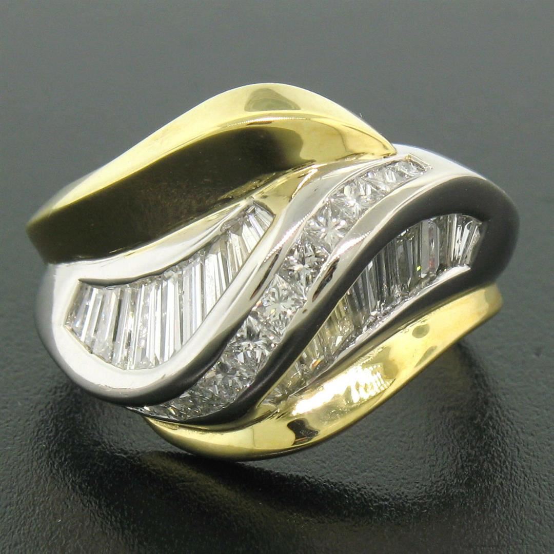 One 18k Yellow Gold & Platinum Wavy 2.50ctw F VS1 Baguette & Princess Diamond Ring. Item Details: Material: 18k Solid yellow gold and .950 Solid Platinum , Weight: 11.30 Grams , Stone(s): (20) Natural Genuine Diamonds - Baguette Cut - Channel Set - F Color - VS1 Clarity, (12) Natural Genuine Diamonds - Princess Cut - Channel Set - F Color - VS1 Clarity, Total Carat Weight: 2.50, Width: 16.0mm, Size: 7.0, Condition: Ring is in 100% Like new perfect condition.