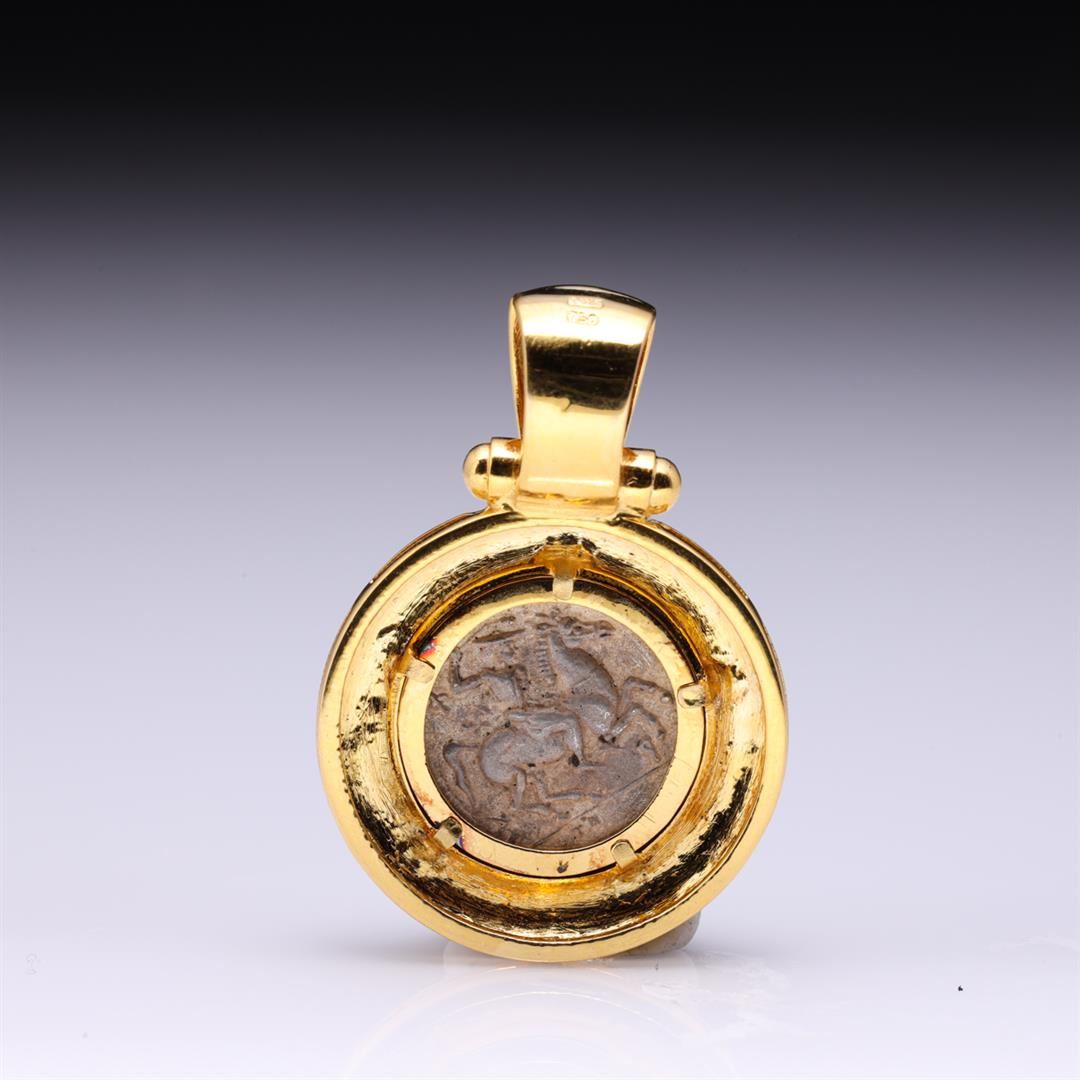 18k Yellow Gold Tourmaline & Greek Coin Pendant containing pear shaped pink tourmaline weighing approximately 0.50 cts. Total weight is 16 gm. Estimated retail value $2,800.