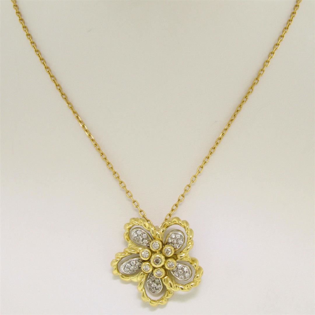 An excellent condition 18kt yellow and white gold flower pendant necklace with 1.22ctw of round diamonds (F - VS1). 20 inch cable link chain, 14.7 grams total weight, measures 27.7x27.0mm.