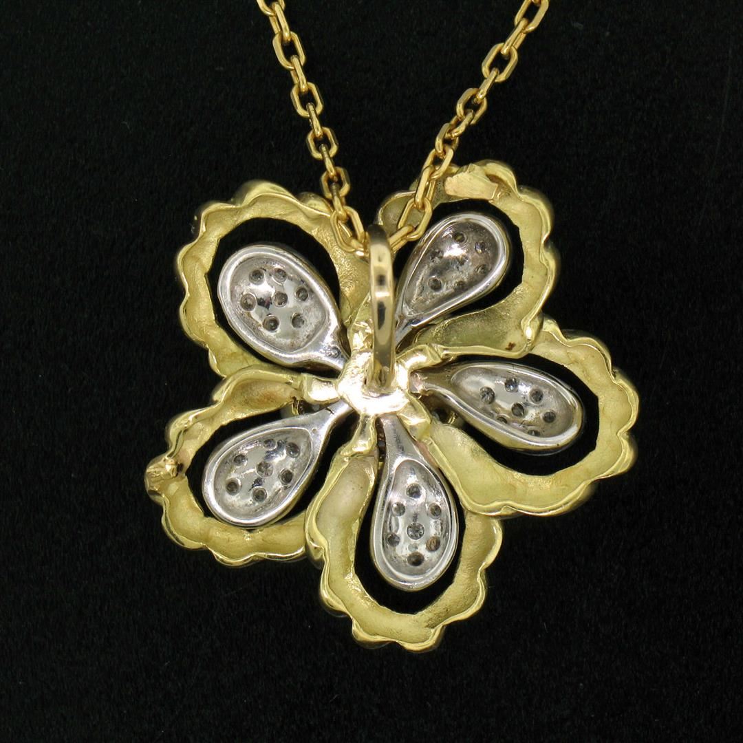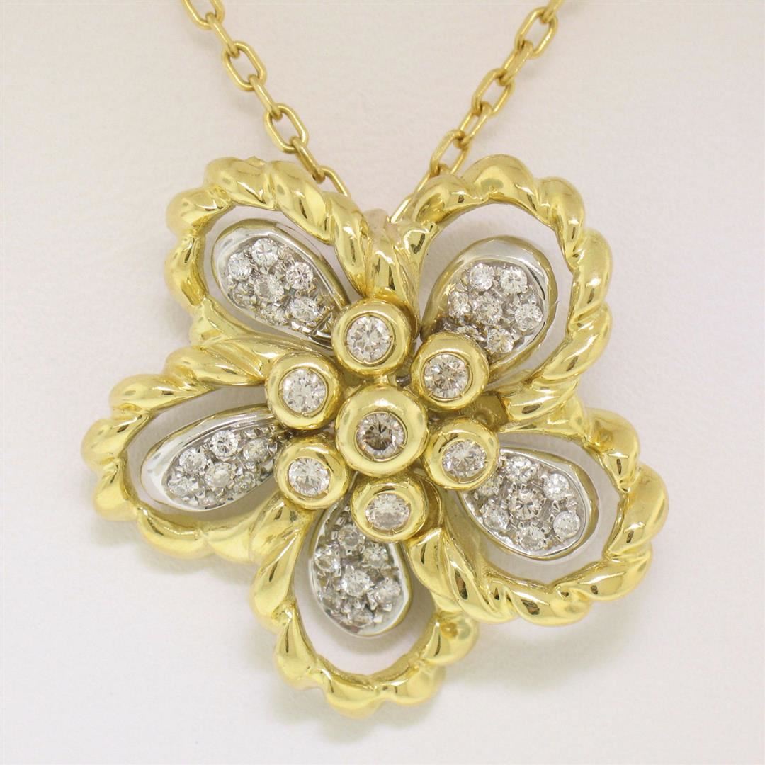 An excellent condition 18kt yellow and white gold flower pendant necklace with 1.22ctw of round diamonds (F - VS1). 20 inch cable link chain, 14.7 grams total weight, measures 27.7x27.0mm.