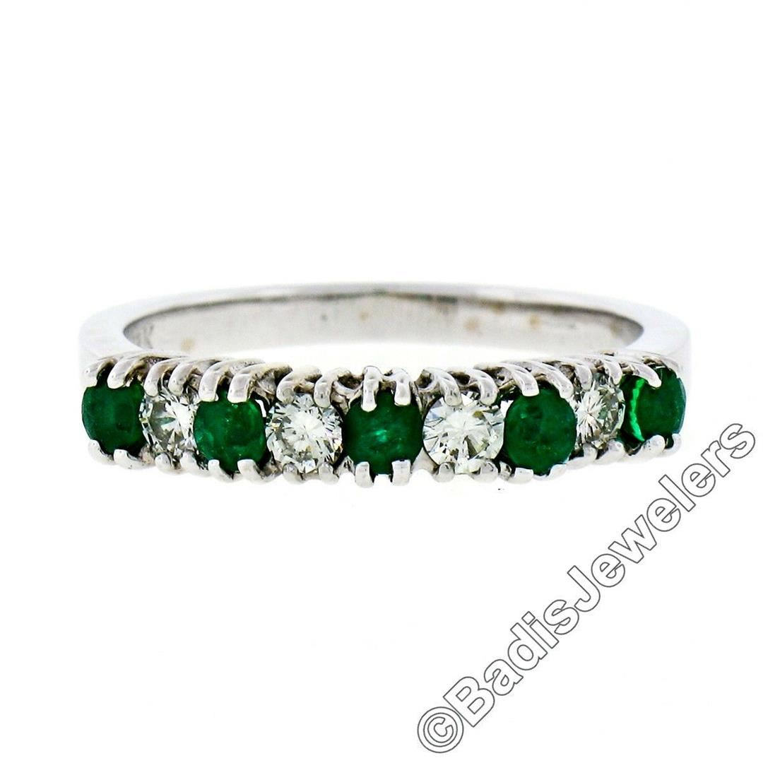An 18kt white gold band ring featuring 5 round brilliant emeralds (0.80ctw) and 4 round brilliant diamonds (F/G - VS1/VS2; 0.56ctw) set in an alternating pattern. The ring is size 6.5, weighs a total of 3.30 grams, and measures 3.75mm wide.