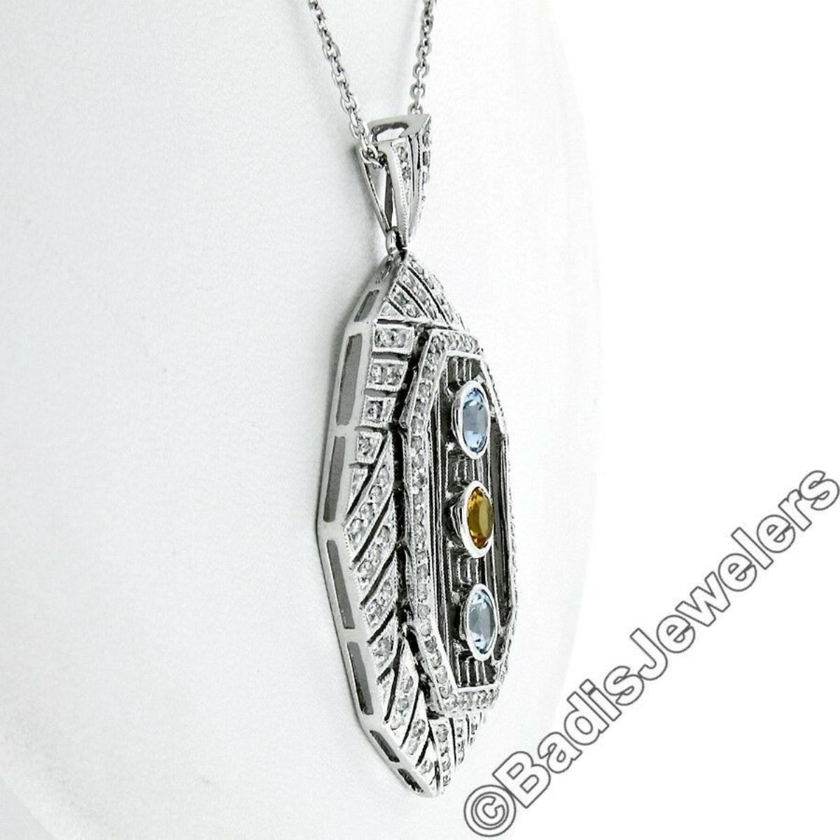 An 18kt white gold open work milgrain accented pendant featuring a center round cut citrine (0.25ct) flanked by a pair of round cut aquamarines (0.80ctw) surrounded by pave set round brilliant diamonds (G/H - VS1/VS2; 1.10ctw). 17 inch cable link chain, 13.42 grams total weight, pendant measures 53.3x30.6mm.