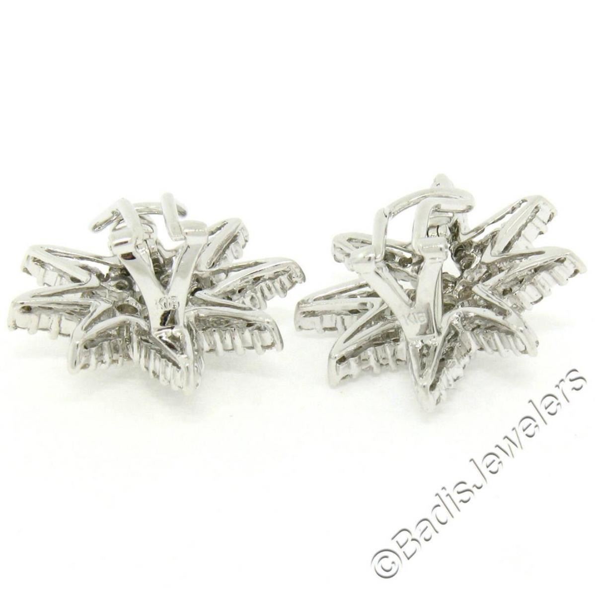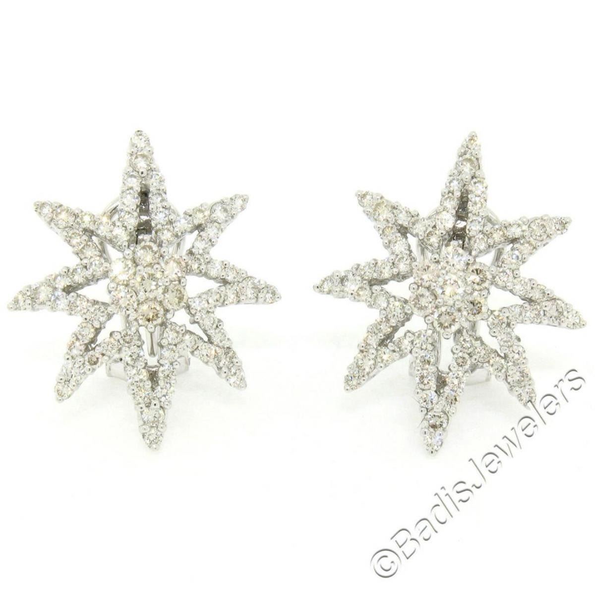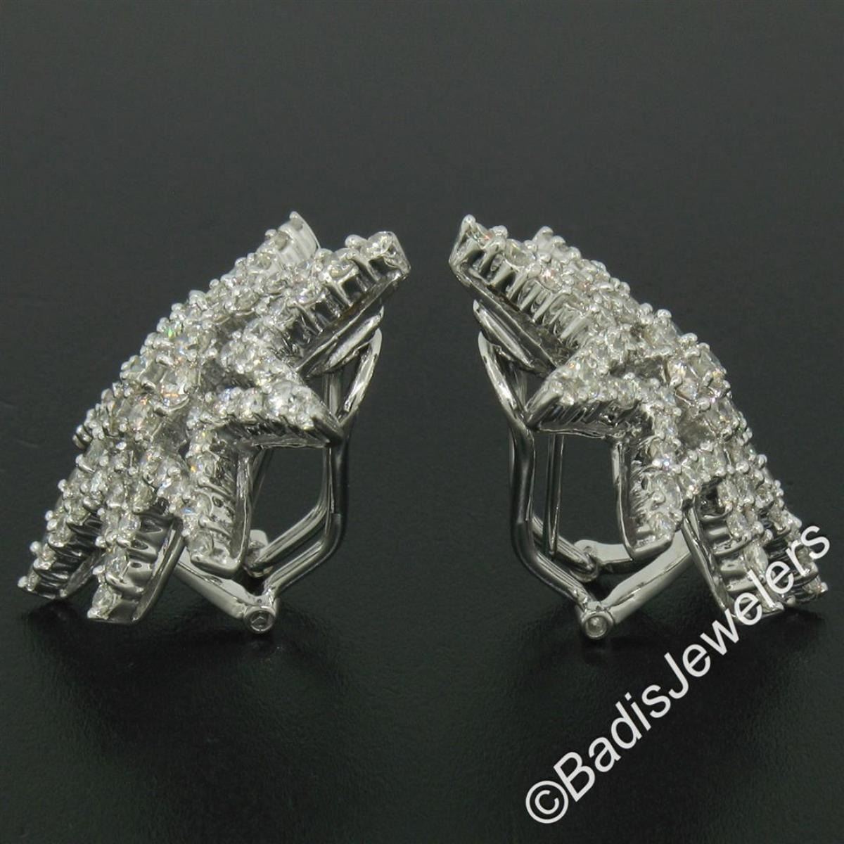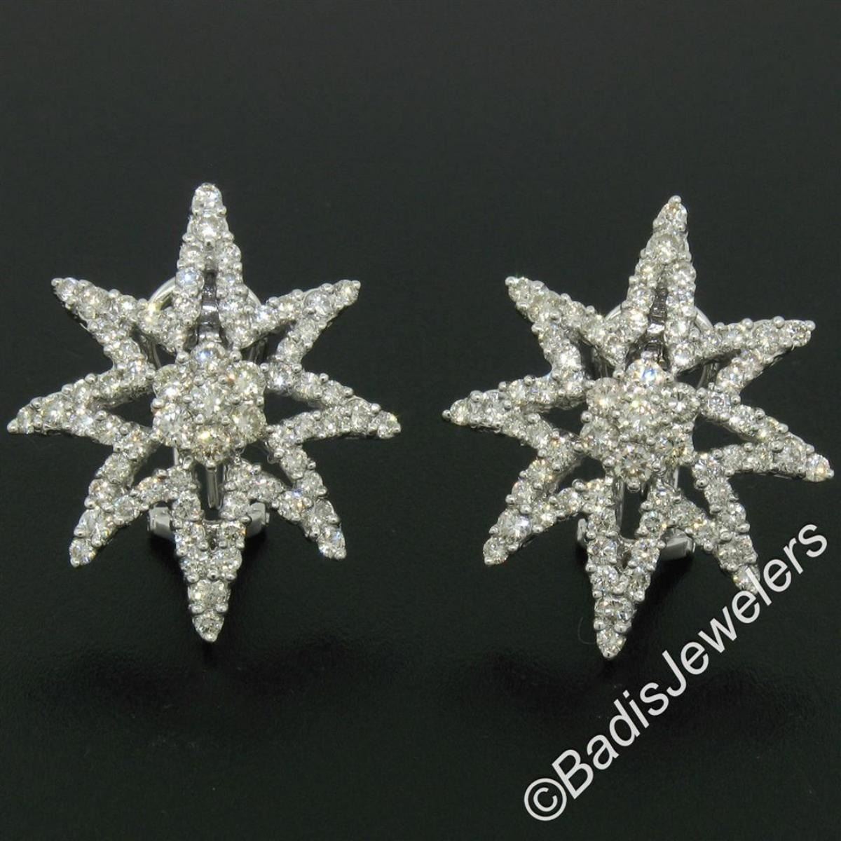 Like new 18kt white gold earrings prong set with 3.35ctw of round diamonds (G/H - VS1/VS2). The earrings have folding posts with omega closures, measure approximately 24.10x28.25mm, and weigh a total of 13.43 grams.