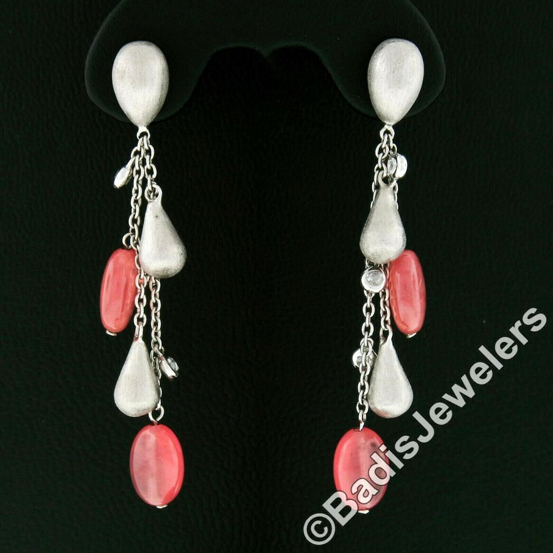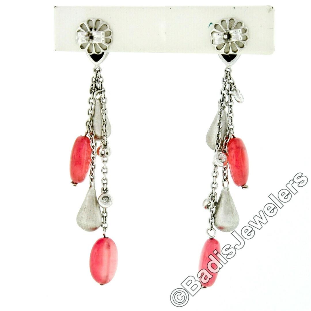 A pair of 18kt white gold dangle earrings featuring 4 oval tumbled beads of rose quartz and 6 round rose cut diamonds (G - VS2; 0.12ctw). The earrings measure approximately 56.0x9.0mm and weigh a total of 9.76 grams.