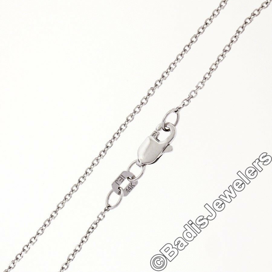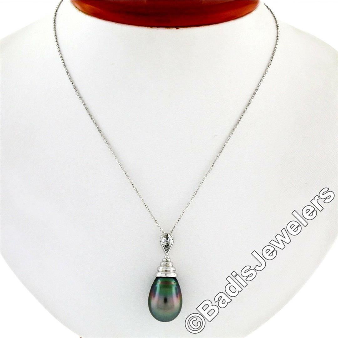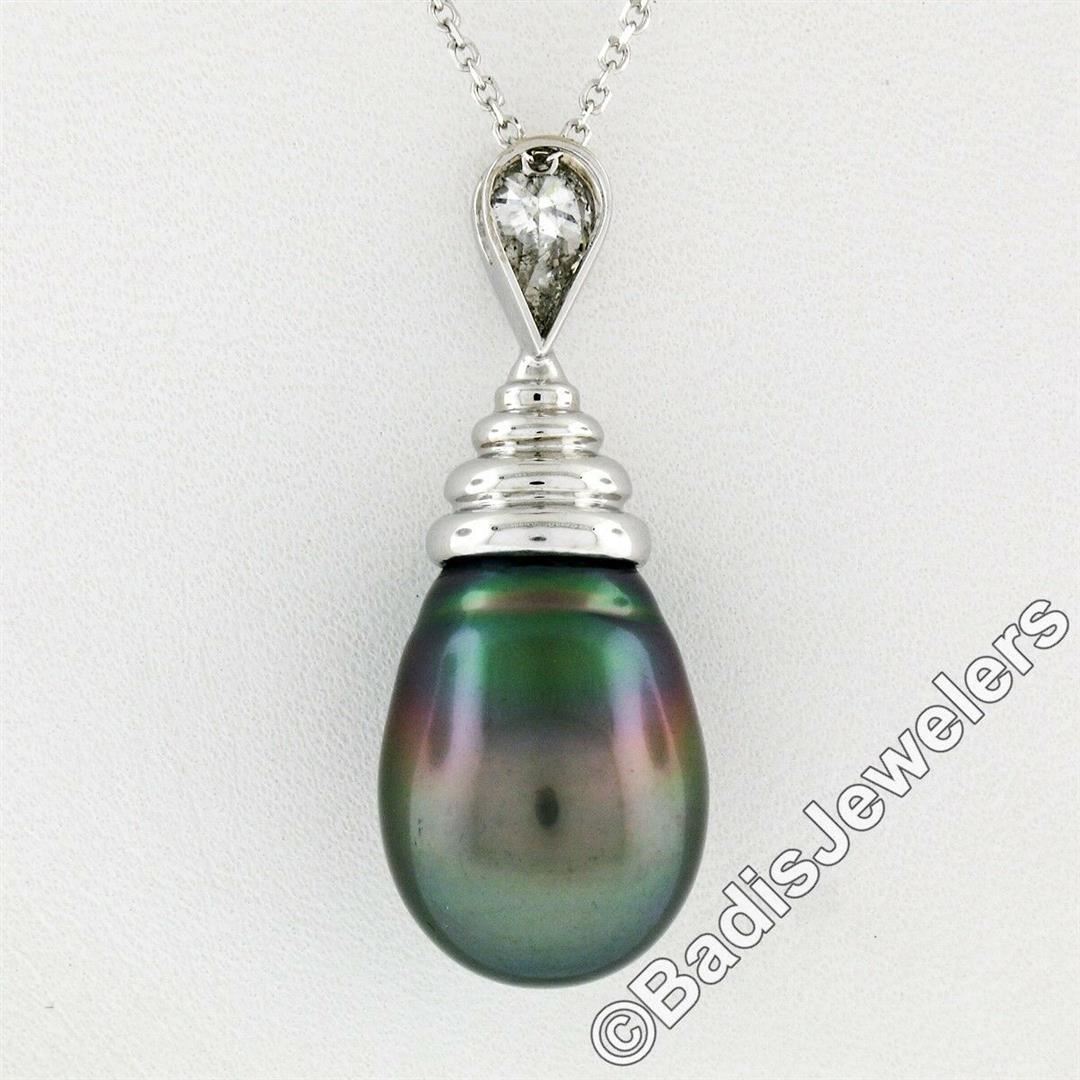 An 18kt white gold dangle pendant featuring a teardrop shaped cultured Tahitian pearl and a 0.60ct pear cut diamond (G - I1) hanging on a 14kt white gold chain. 18 inch beveled cable link chain, 7.60 grams total weight, pendant measures 32.46x12.65mm.
