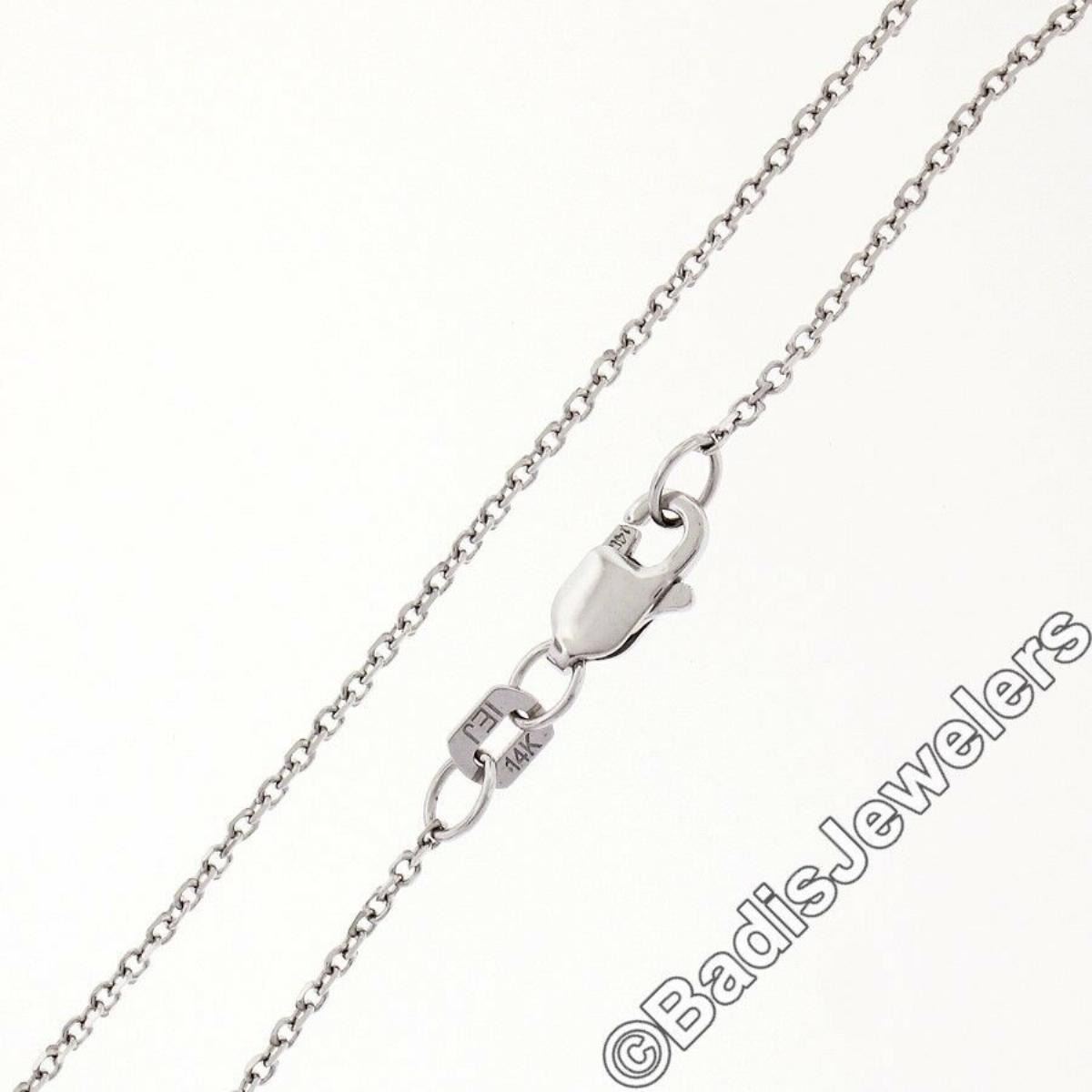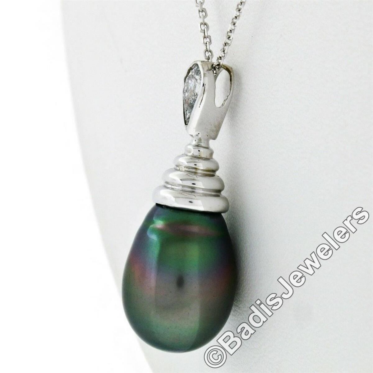 An 18kt white gold dangle pendant featuring a teardrop shaped cultured Tahitian pearl and a 0.60 ct pear cut diamond (G - I1) hanging on a 14kt white gold chain. 18 inch beveled cable link chain, 7.60 grams total weight, pendant measures 32.46x12.65mm.