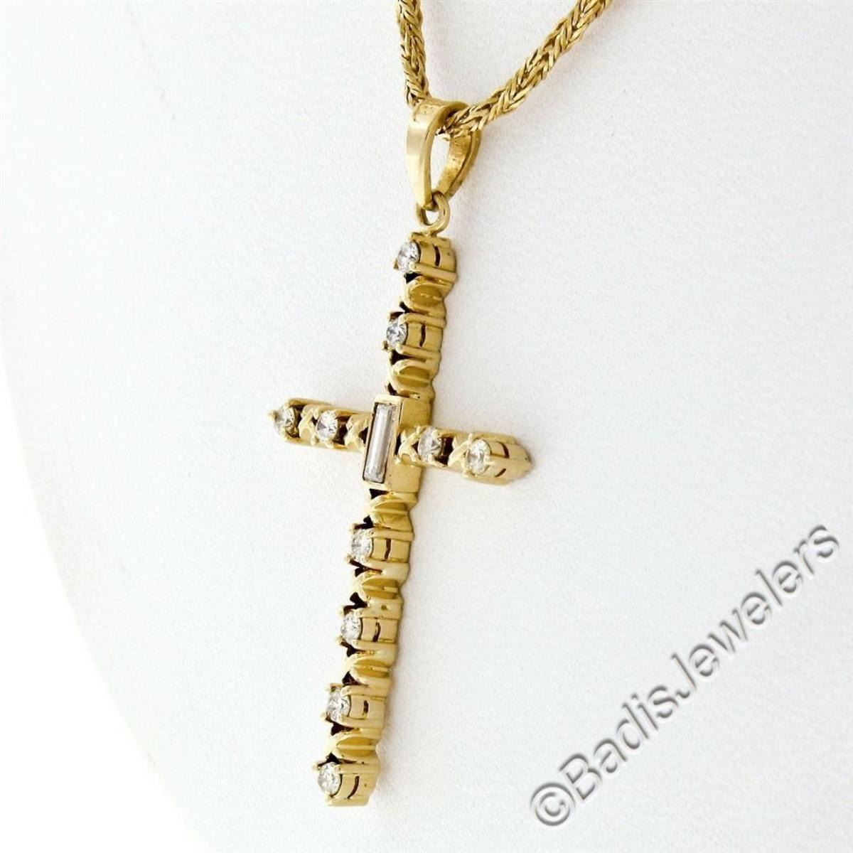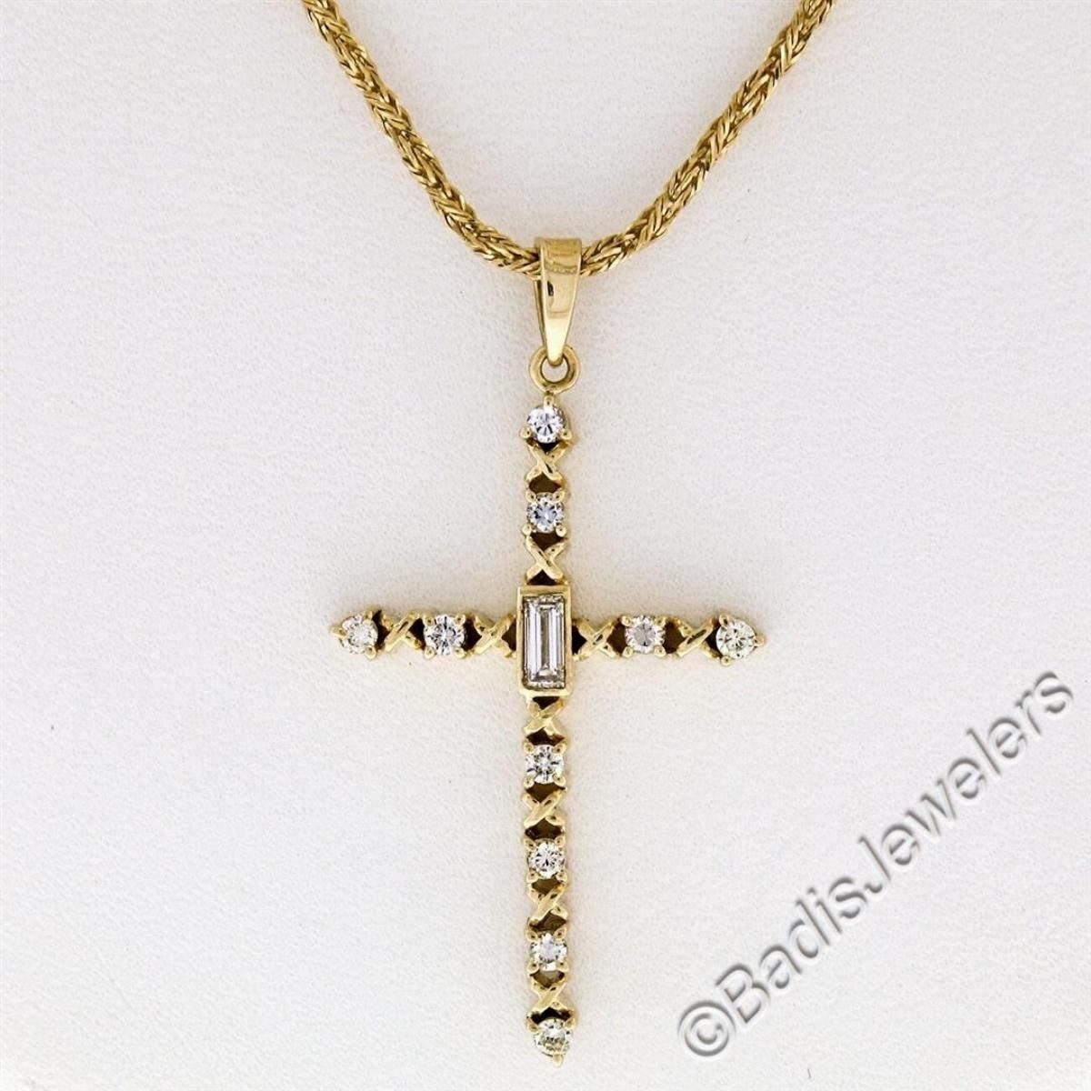 An 18kt yellow gold diamond cross pendant with 0.40ctw of round and baguette cut diamonds (F/G - VS2). 24 inch beveled diamond cut wheat link chain, 9.59 grams total weight, measures 40.0x21.3mm.