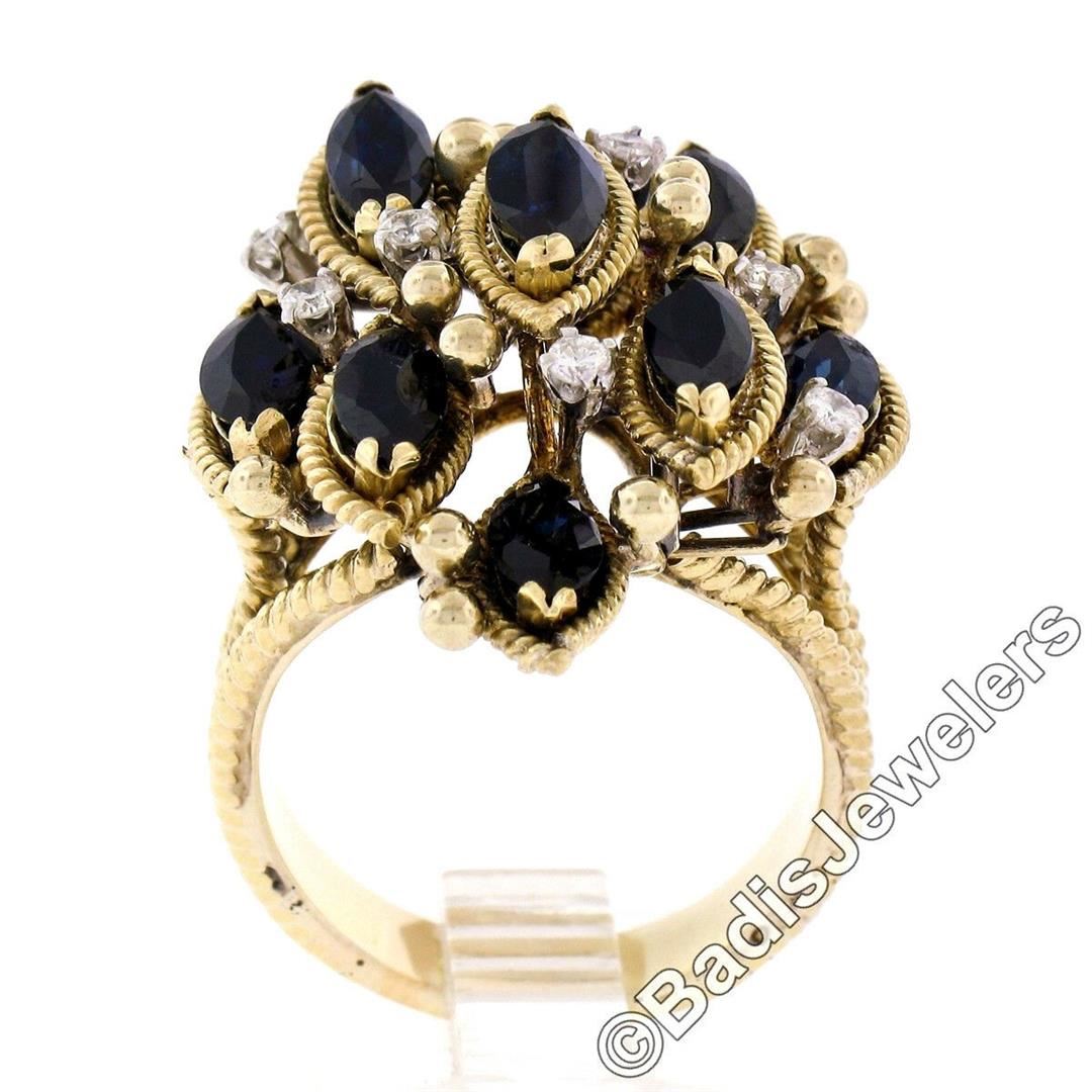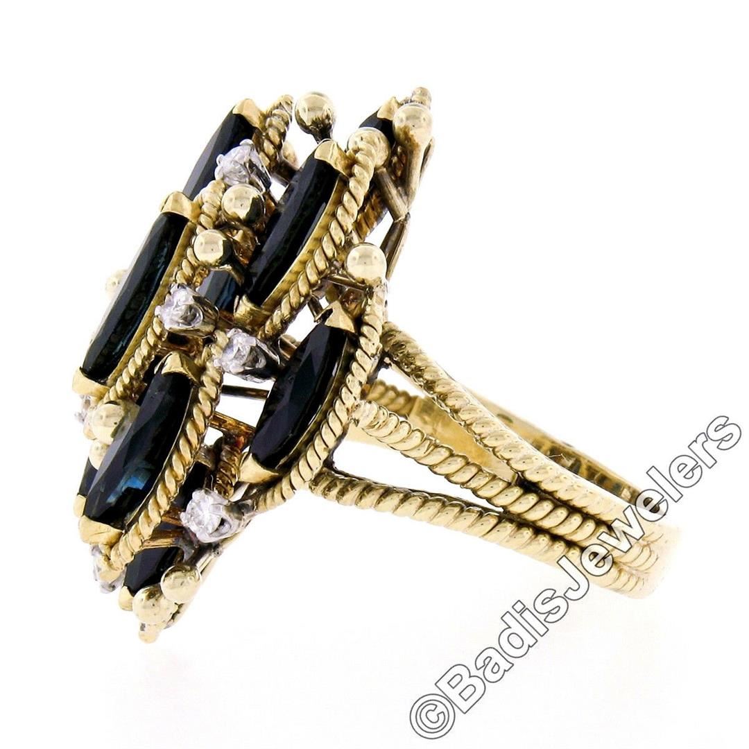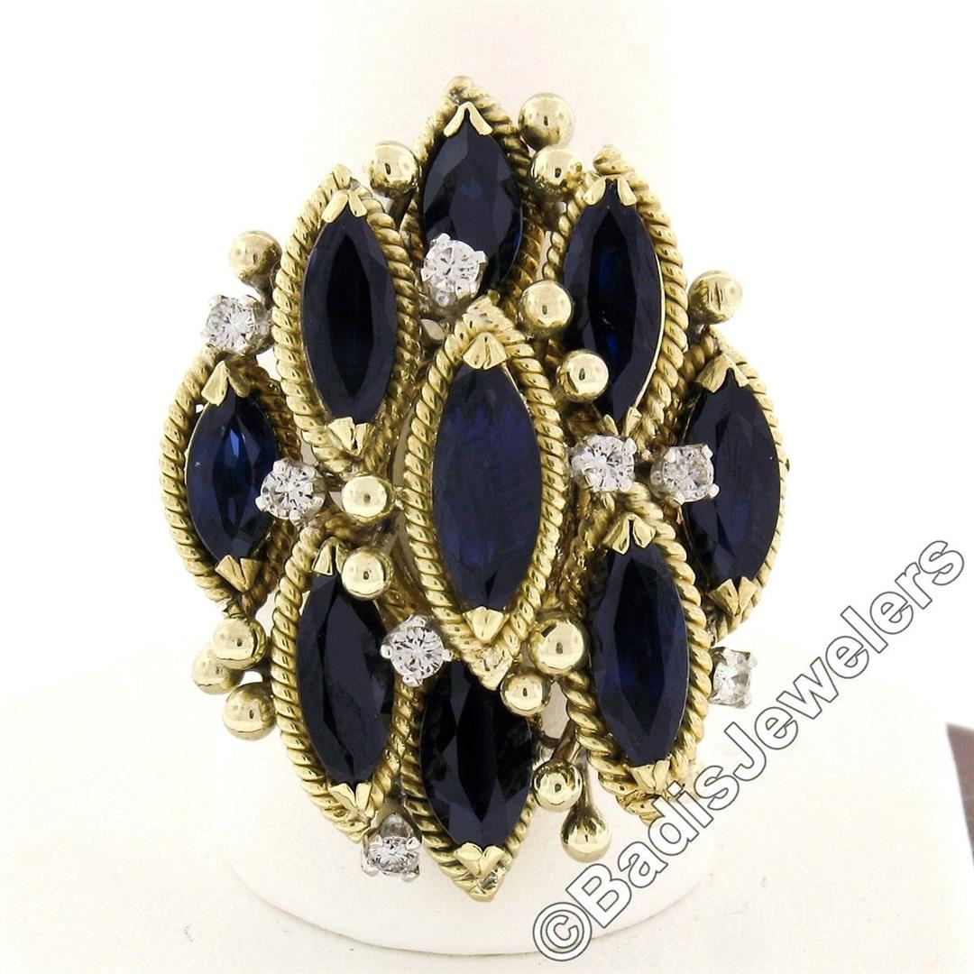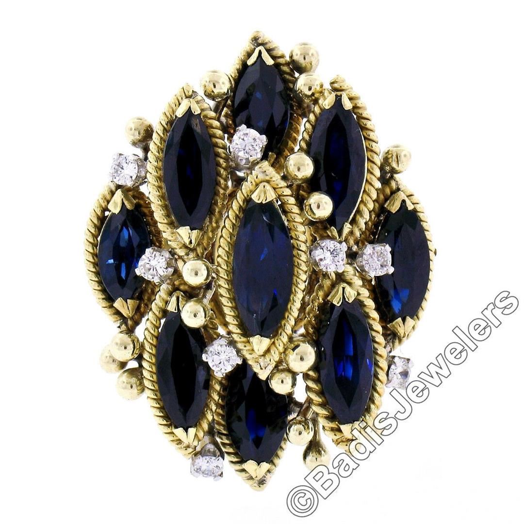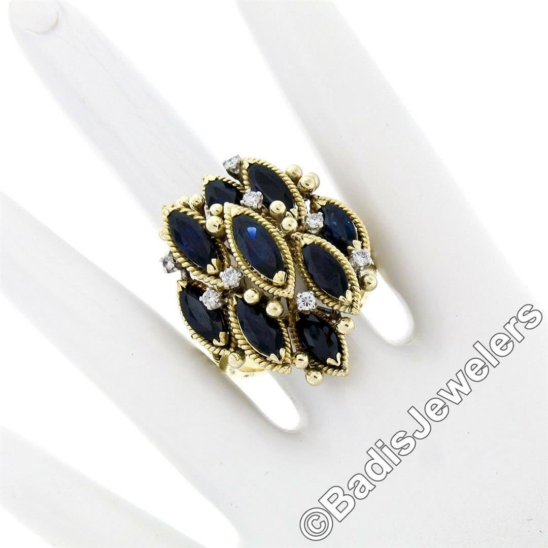 An 18kt yellow gold tiered cocktail ring featuring 9 marquise cut blue sapphires (7.05ctw) accented by 8 round brilliant cut diamonds (E/F - VS1/VS2; 0.32ctw). The ring is size 9.5, weighs a total of 17.45 grams, and measures 32.30mm wide.