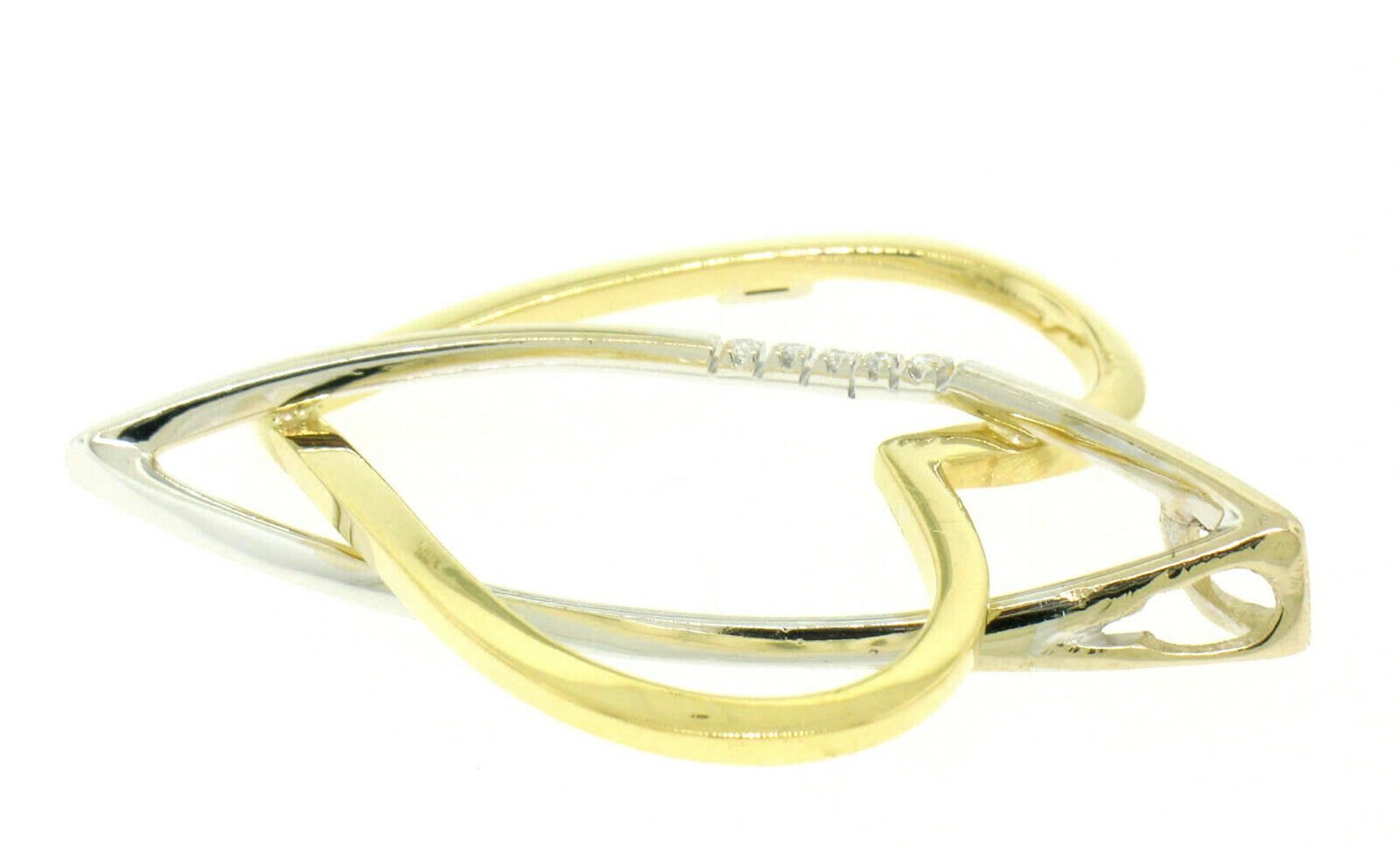 A like new 18kt gold pendant featuring a yellow gold open heart intertrwined with a white gold open marquise shape which is prong set with 0.05ctw of round diamonds (G - VS2). The pendant weighs a total of 6.1 grams and measures 40.72x30.16mm.
