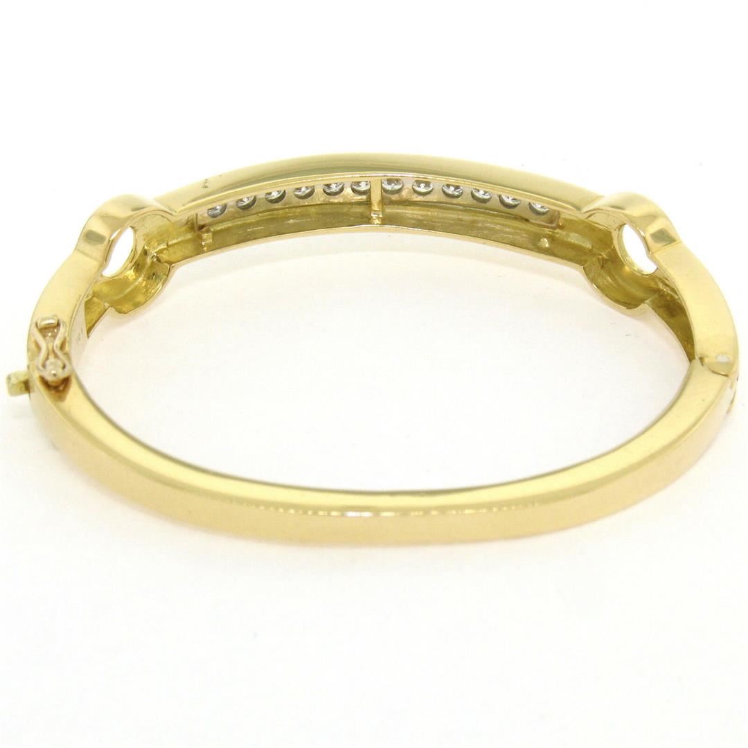 An excellent condition 18kt yellow and white gold bangle bracelet with 1.01ctw of round diamonds (F - VVS1). It weighs a total of 27.29 grams, measures 11.70mm wide, and will fit up to a 6.5 inch wrist.