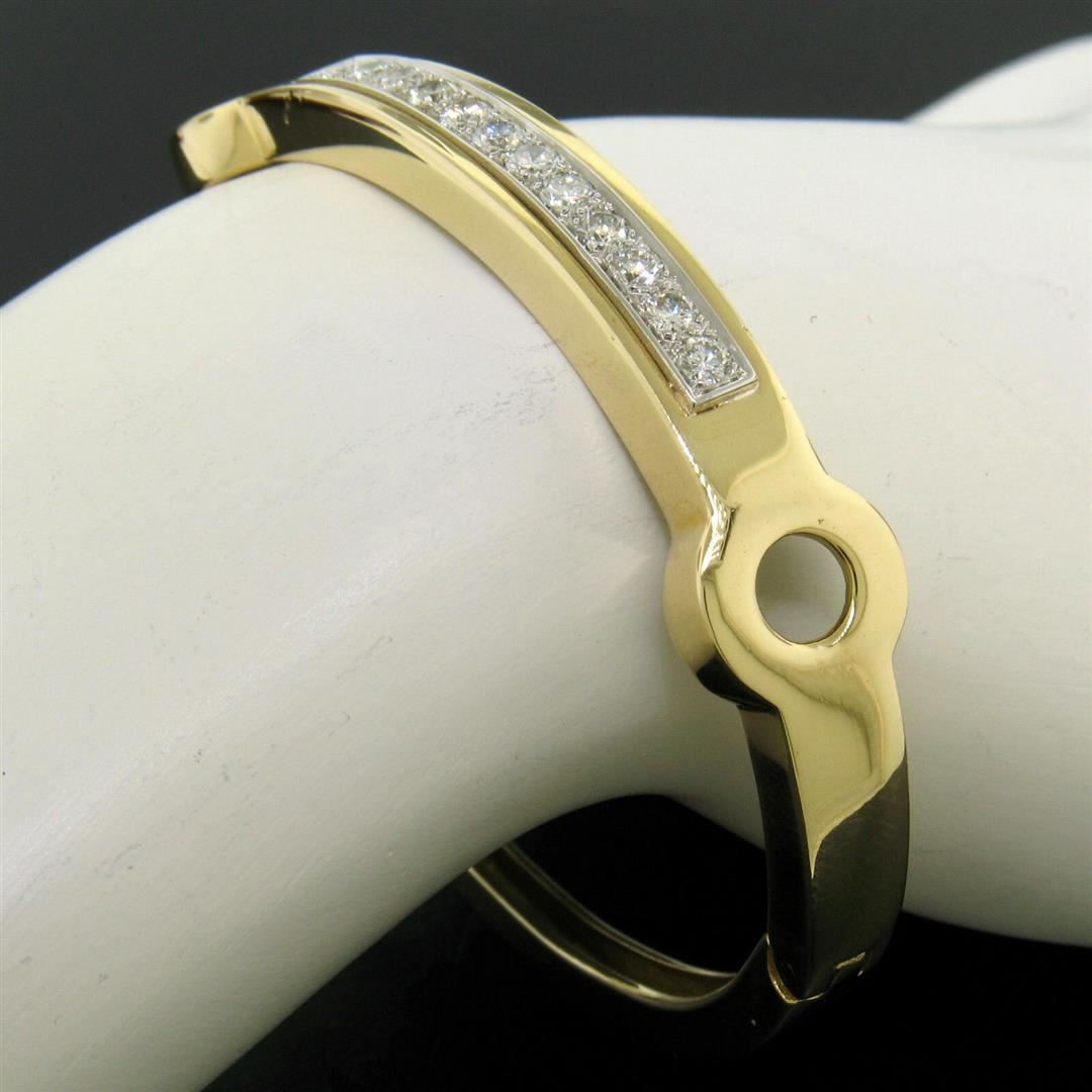 An excellent condition 18kt yellow and white gold bangle bracelet with 1.01ctw of round diamonds (F - VVS1). It weighs a total of 27.29 grams, measures 11.70mm wide, and will fit up to a 6.5 inch wrist.