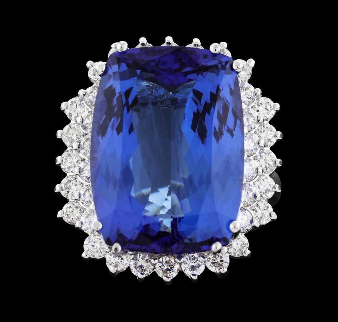 One electronically tested 14KT white gold lady's cast fashion ring with a cathedral shank with a basket halo with a bright polish finish. The featured lady's ring has a shank measuring 2.39 millimeters wide. Identified with markings of 'K14'. Condition is new, good workmanship. Containing: One prong set rectangular cushion modified brilliant cut natural tanzanite, measuring 18.54 x 13.60 x 8.35mm, (depth est.) 17%. bulge factor, approximate weight of 19.30ct., clarity is eye clean, medium, very slightly grayish, blue color, (GIA B 5/3), cut is very good. Transmitting light with no distortion, transparent. Colored gemstones are presumed to have been subjected to commonly used enhancement processes. Graded in the setting. Thirty-Six prong set round brilliant cut diamonds, measuring 2.20 - 2.10 x 1.33mm (depth est.) approximate total weight of 36 Stones = 1.35ct. Graded in the setting. Clarity SI-1 to I-1. Color: G - H Cut Good. Total Weight of Colored Stones 19.30ct.. Total Weight of Diamonds 1.35ct.. Total Weight of Ring 11.20gm. GAS Appraised.