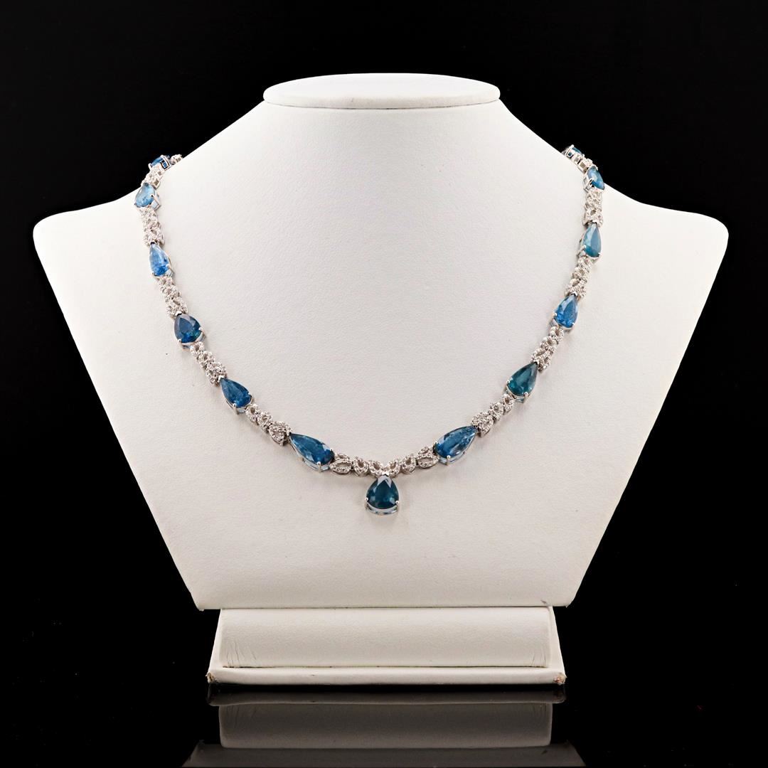 Fourteen karat (14K) white gold natural aquamarine beryl and diamond necklace. Pear brilliant cut natural aquamarine beryl gemstones are mounted in the center of the necklace. brilliant cut diamonds accent the necklace between the center gemstones. The ne