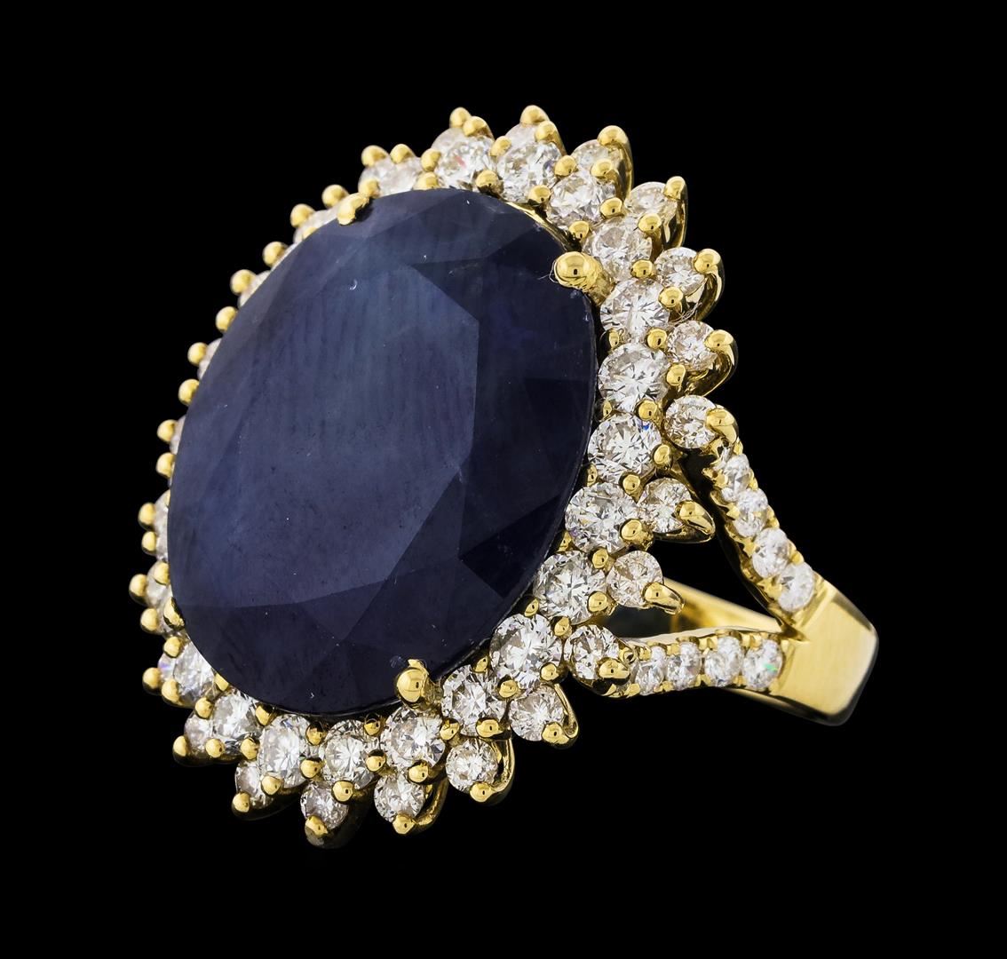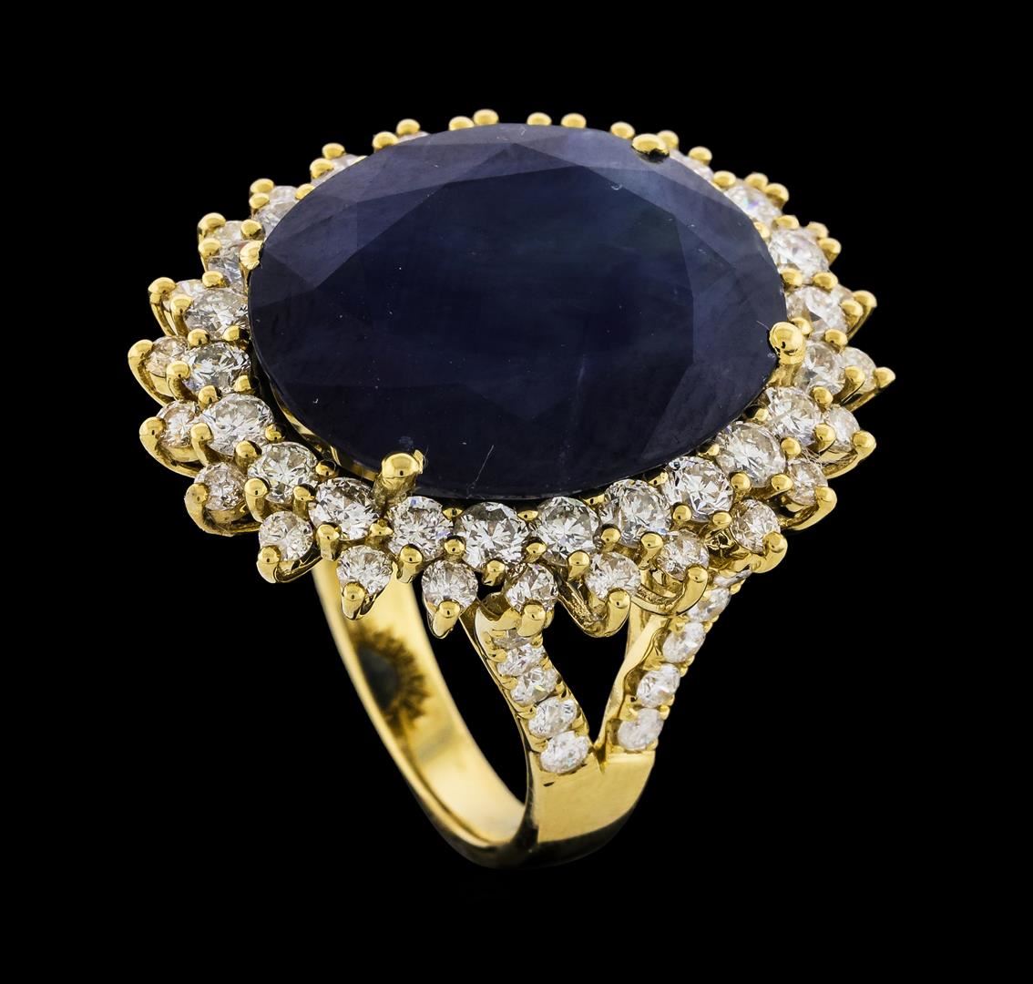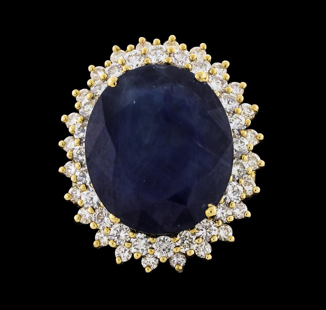 One 14KT yellow gold lady's ring, containing: 14KT yellow gold, 12.70 gr. Main gemstone: Identity: Burma color sapphire. Carat weight: 19.72 cts tw. Shape and measurement: oval shape. Approx.: 19.85 x 16.83 mm. Quality: no heat. Fine cutting. Adjacent gemstones: Identity: Natural Diamond. Shape: round brilliant cut. Carat weight: 2.99 cts tw. Quality: all VS clarity, E-F color. All fine cutting and proportions. Total gemstones weight: 22.71ct.