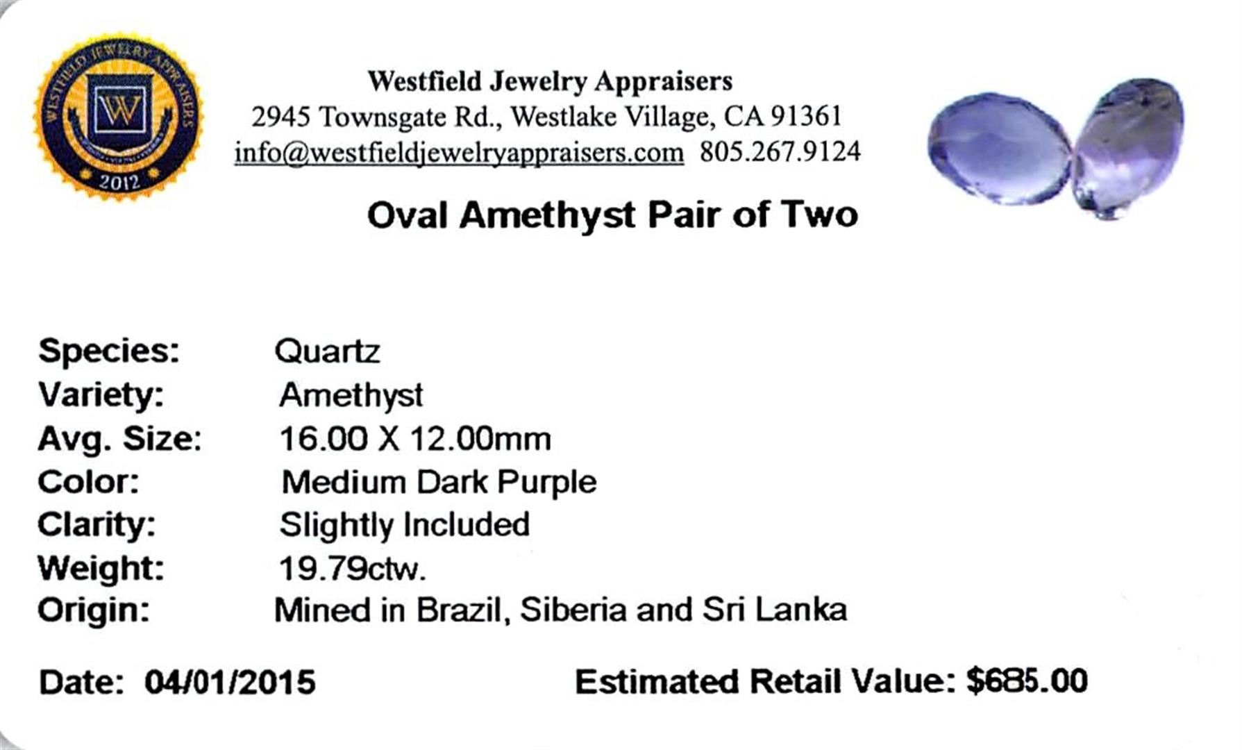 Two oval mixed cut natural amethysts exact total weight 19.79ct., clarity is eye clean, type II, medium dark, very slightly grayish, purple color, (GIA P 6/3), cut is good. Westfield Appraised.