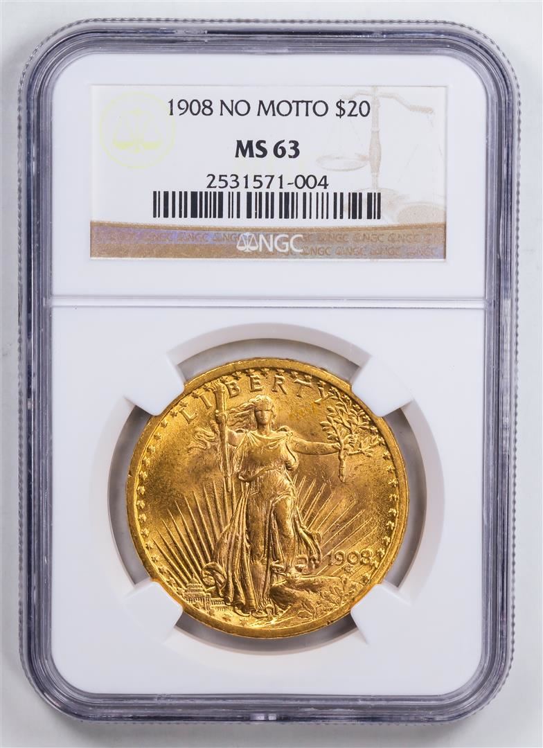 One 1908 $20 No Motto Double Eagle Gold Coin NGC MS63.