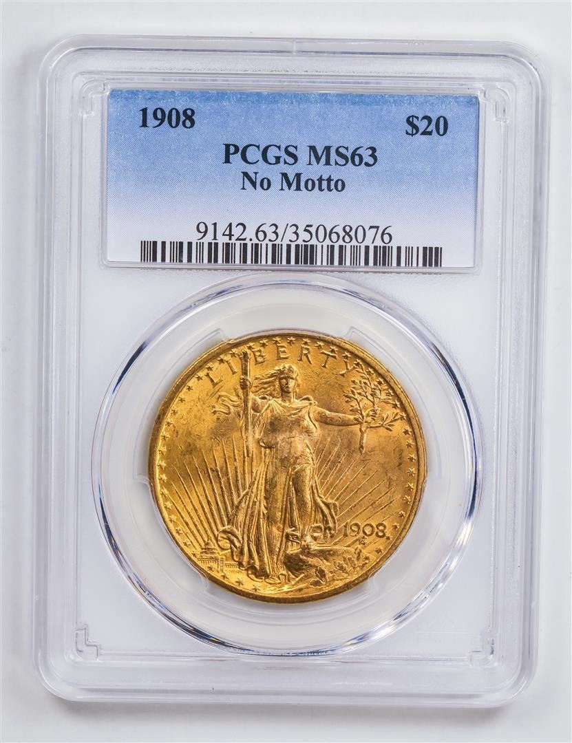 One 1908 $20 No Motto Double Eagle Gold Coin PCGS MS63.