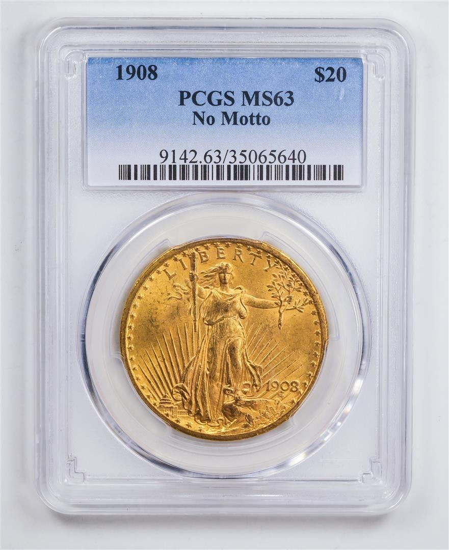 One 1908 $20 No Motto Double Eagle Gold Coin PCGS MS63.